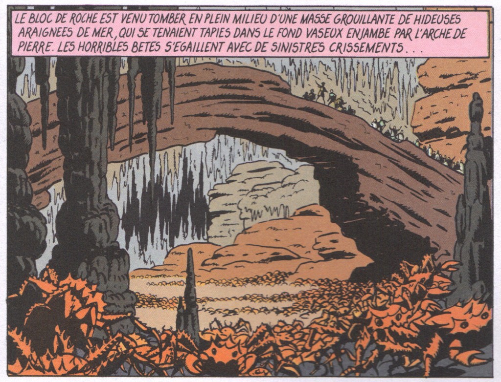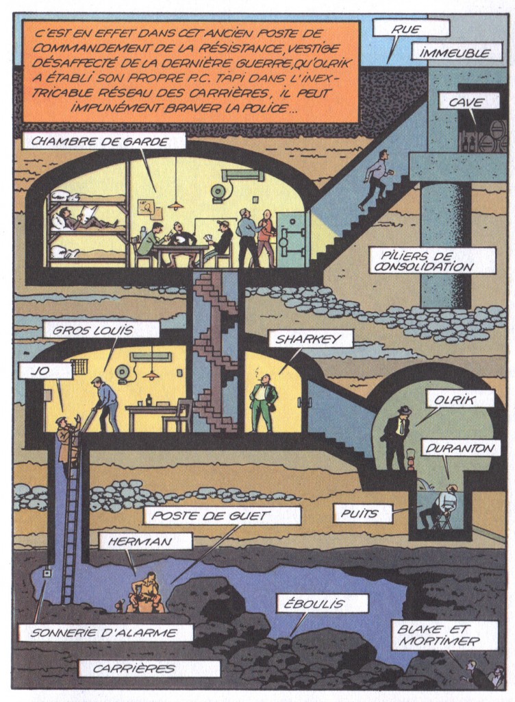 Il est indéniable que le sous-sol hante le père de Blake et Mortimer ; il y recourt de façon systématique, aucune des huit aventures n’y échappe. Pourtant cette récurrence est loin d’être univoque, tant sont variées les occurrences d’un épisode à l’autre, que ce soit sur la forme de l’espace souterrain, son occupation ou la charge symbolique qu’il présente. Ce dernier item mérite d’ailleurs un complément : l’usage du souterrain est toujours allégorique, que ce soit le repère de quelque Frankenstein, l’arche des Gentils ou le parcours initiatique du héros.