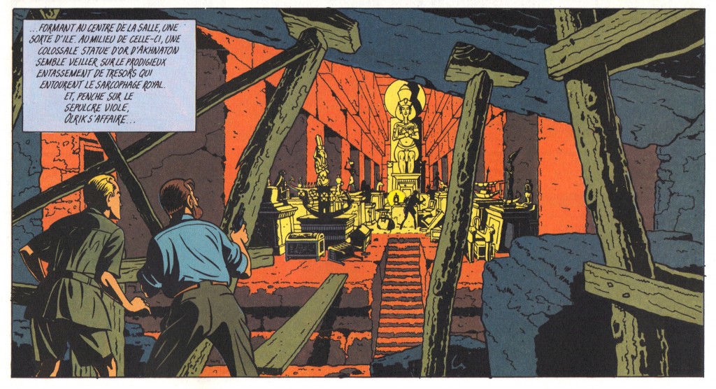 Pour ses deux héros, mais plus spécialement pour Mortimer, le passage par le sous-sol s’apparente à une initiation. Le procédé, selon un schéma rodé, se répète à l’envie : le (ou les) héros pénètre sous terre par un accès ouvert au commun des mortels (ou presque) ; c’est la grotte des Açores visitée lors d’une expédition spéléologique dans L’Énigme de l’Atlantide, le Mastaba du docteur Groβgrabenstein dans Le Mystère de la Grande Pyramide, les égouts dans La Marque jaune ou encore la cave de la Bove dans Le Piège diabolique. Ce premier espace accessible, donne ensuite accès à un second niveau de souterrain, celui-là ouvert uniquement aux « initiés ». Pour reprendre les exemples supra, les héros, considérés comme ayant soit un cœur pur, soit le niveau de connaissance pour être affranchis, pénètrent ainsi, après une série d’épreuves, respectivement dans la cité souterraine des Atlantes, la Chambre d’Horus, le laboratoire du docteur Septimus ou encore celui du professeur Miloch Georgevitch. La grande épreuve ne fait alors que commencer, la mort rôdant, prête à les emporter. Ils en réchappent de justesse, renforcés spirituellement ou intellectuellement mais incapables de transmettre ce savoir neuf, soit en raison d’une amnésie14, du caractère extravagant pour les non-initiés de ce qu’ils ont vécu15 ou encore de la destruction de ce dont ils ont eu connaissance16.