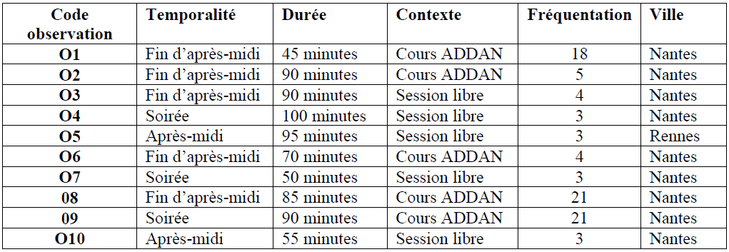 Le corps du traceur participe à l’esthétisation de l’environnement par l’attribution de significations à l’espace (Ameel et Tani, 2012b) et l’interaction physique homme-milieu engage alors une lecture compréhensive et sensible de l’environnement par opposition au fonctionnalisme de la ville (Lebreton et Andrieu, 2011). L’excellente maîtrise du corps nécessaire (Miaux, 2009) passe par l’entraînement et la répétition puisque la ville, terrain d’évolution, présente une diversité de défis physiques (Ameel et Tani, 2012b), l’activité consistant à une articulation des individus dans l’espace sans autre outil que leur corps et les éléments de la ville – mobilier, surface, bâtiments – qui développent des aptitudes originales. L’entraînement se déroule sur un spot où les traceurs répètent des sauts, franchissements ou acrobaties. Chaque mouvement est unique selon son contexte : une même distance entre deux pavés et deux bancs n’entraîne pas la même appréhension (Observation O4) et les encadrants varient les lieux pour « diversifier les situations et changer d’environnement » (Observation O1). En matière de déplacement, la prégnance de la dimension corporelle révèle la perte d’athlétisme dans les mobilités quotidiennes puisque, comme l’observe Margot Baldassi pour pop-up urbain, le saut a presque disparu des villes. Elle met en avant l’importance de recentrer l’urbanisme sur l’échelle de l’individu, donc de repenser le déplacement comme une activité avant d’être un moyen, y compris dans une mobilité.