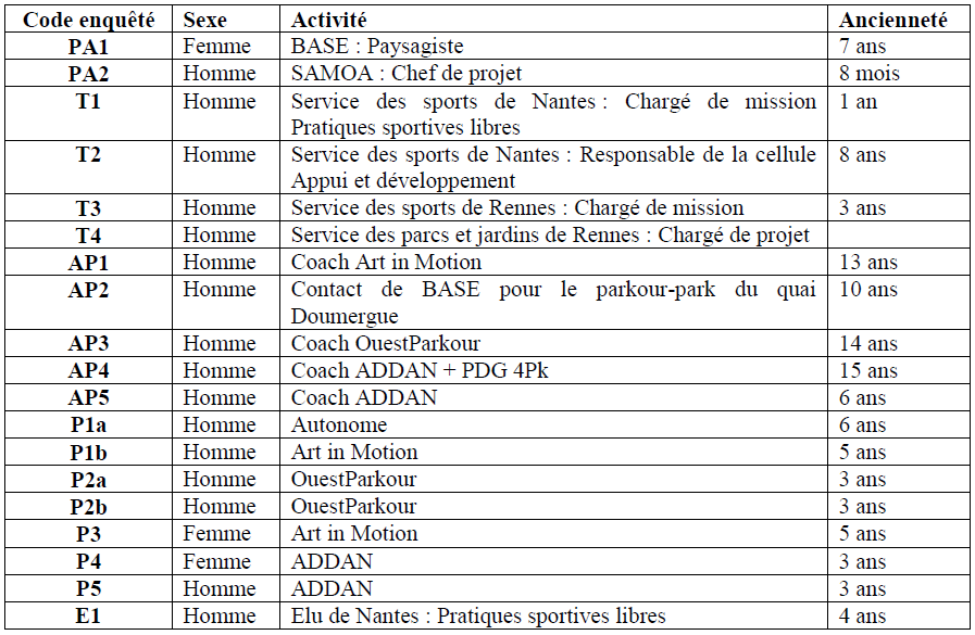 La recherche repose sur un travail de préparation à une recherche doctorale. Par les entrées sociologique, géographique, aménagiste et psycho-environnementaliste, plusieurs modes d’appréhension de la pratique sont mobilisés : les loisirs diversifiés prégnants dans la société contemporaine, la dominante des jeunes parmi les pratiquants, l’appropriation spatiale à l’œuvre à travers elle, les questions urbanistiques de production et de gestion d’un espace public aux usages diversifiés et enfin l’écologie corporelle pour appréhender la réintroduction du rapport sensible à l’espace. Les principaux résultats proviennent d’une démarche de terrain menée en 2018 à Rennes et à Nantes auprès de pratiquants, responsables et acteurs institutionnels à travers des phases d’observation interactive et des entretiens compréhensifs semi-dirigés. Les traceurs observés se divisent principalement en deux groupes. Le premier est celui d’une association locale – l’Art Du Déplacement Academy Nantes (ADDAN) – proposant des cours encadrés, caractérisé par une dominante adolescente puisque sur les 69 traceurs, seuls 2 avaient plus de 20 ans, et 49 avaient entre 12 et 15 ans. Le second est celui des sessions libres, marqué par un caractère juvénile d’une plus grande amplitude puisque sur les 16 traceurs rencontrés, la moitié avaient plus de 20 ans, et seulement 3 entre 12 et 15 ans. La réflexion amène dans un premier temps à approfondir la question du corps en ce qu’il est un moyen de déplacement et le média d’un rapport singulier à l’espace. Au-delà de sa dimension physique, il est intéressant, dans un deuxième temps, d’analyser les implications sociales du parkour dans la société urbaine. Finalement, une récréativité semble émerger dans l’habiter, y compris pour se déplacer, illustrée et construite par le parkour.