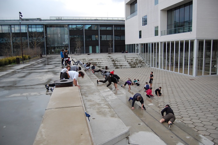 S’il fallait retenir un mouvement du parkour, les traceurs (nom des pratiquants) répondraient le « prec’ », ou saut de précision, car il est emblématique : c’est un mouvement de déplacement en sautant, rompant avec la marche dominante en ville ; il représente la priorité donnée à l’action-même, primant sur la finalité du point d’arrivée ; et il revêt une dimension « esthétique » par une réception avec la seule pointe des pieds sur le rebord du support. Ce saut est donc une action de déplacement, différente de la « mobilité », sujet récurrent des réflexions géographiques et pluridisciplinaires et enjeu majeur de l’aménagement urbain pour qui elle a une finalité, i.e. une destination telle que se rendre au travail, transmettre une information ou envoyer un colis. Or bouger – ou se mouvoir – ne s’inscrit pas nécessairement dans cette vision fonctionnaliste du déplacement, à l’image du saut de précision. C’est justement ce « bouger » qui nous anime et nous interroge, ce déplacement qui devient une fin en soi.