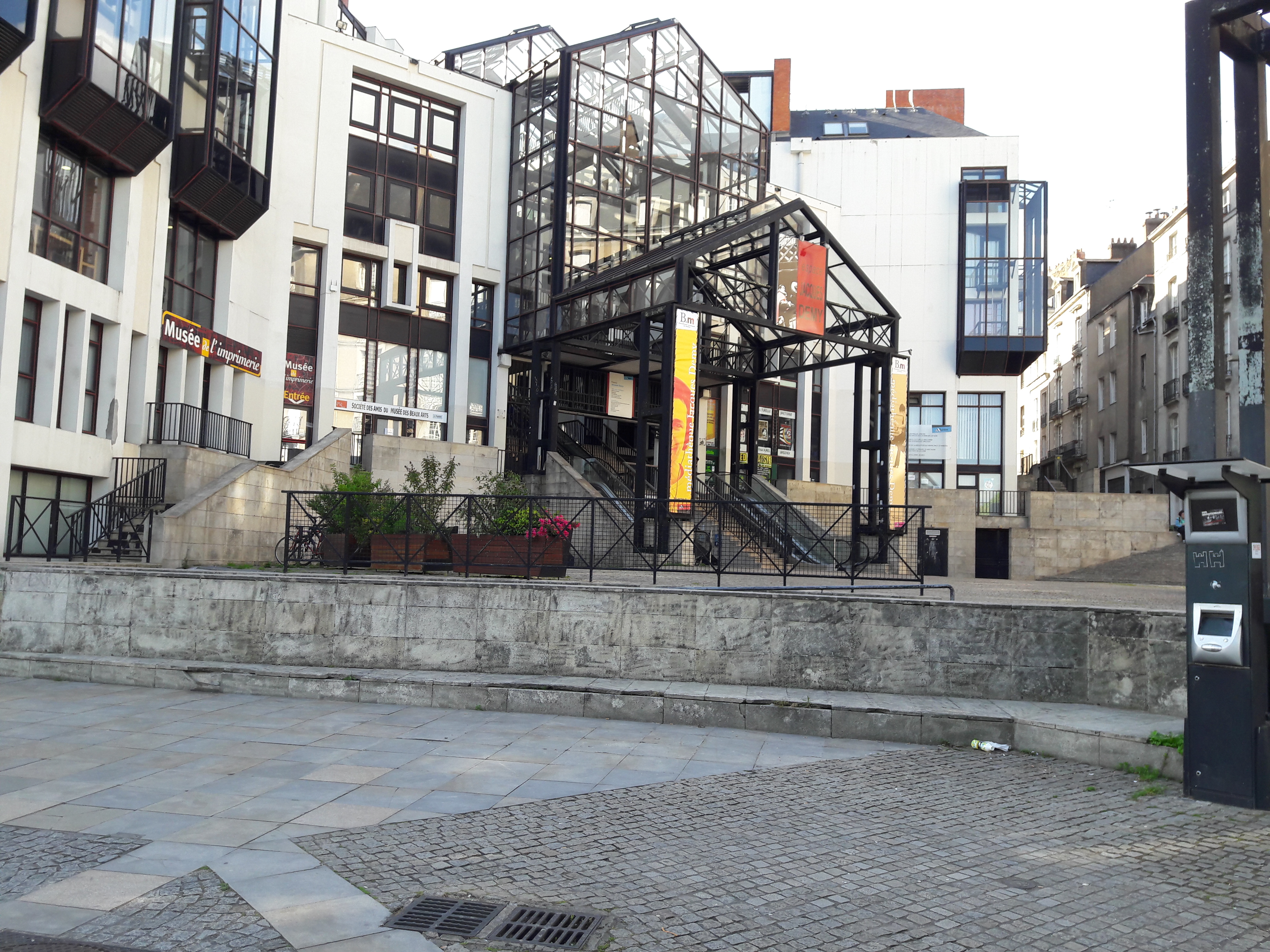 Le corps génère et produit l’espace (Lefebvre, 1974 ; Di Méo, 2010 ; Friedman et Van Ingen, 2011) et son appropriation en est un processus important. Il est double en ce qu’il s’articule dans un premier temps de manière physique, puis prend une forme symbolique. La réappropriation corporelle par l’évolution des traceurs sur des spots leur attribue un sense of place qui renforce l’attachement et la significativité des lieux (Ameel et Tani, 2012b). Le terme « appropriation » est récurrent dans les discours des pratiquants (Entretiens AP1, AP2, P1a, P1b et P5), mais dans sa dimension plus symbolique que matérielle par l’absence de marquage visible ou audible de la pratique, ce qui la rend éphémère. Ses espaces privilégiés partagent certaines caractéristiques techniques – une variété des hauteurs, formes et textures stimulante confirmée par les traceurs rencontrés (Observations O1, O2, O3 et O6) – et pratiques évaluée par la stabilité, la solidité et l’adhérence du mobilier (Ameel et Tani, 2012a). Le spot Média à Nantes (Figure 4) est réputé grâce à sa diversité de longueurs et de hauteurs de sauts et à ses murets, murs, escaliers et rambardes en métal adhérant et robustes donc intéressants. Il a pu y être observé des franchissements, sauts de précision, sauts de chat, sauts de chat-bras et acrobaties (Observation 3) illustrant son intérêt. L’accessibilité gratuite est également primordiale : l’activité permet une libération de l’espace et de l’individu des contraintes sociales, donc du paiement d’un « droit » à faire du parkour et à le faire en ce lieu.