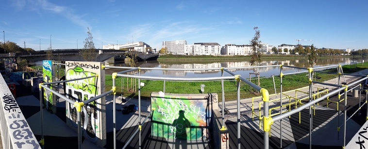 À cet effet, les traceurs rappellent que la nature de cet art du déplacement se trouve dans l’apprentissage de l’attention à l’environnant et de la recherche d’opportunités (Bornaz, 2011), plaçant l’imagination au centre du renouvellement du rapport de l’individu à la ville. Les parkour-parks comme espaces dédiés à l’activité sont donc critiqués en ce qu’ils limitent cette capacité à dépasser les représentations sociales (Entretiens AP5 et P3) car « le parkour c’est utiliser des structures qui ne sont pas faites pour à la base, donc le parkour-park réservé au parkour c’est la logique inverse. » (Entretien AP3). La critique est à relativiser par la déception de l’installation de l’espace sportif Savary à Rennes sans consultation des traceurs locaux, contrairement à d’autres villes. Citons les exemples de Nantes où l’agence BASE a sollicité l’association Art in Motion pour le projet de parkour-park sur le quai Domergue (Figure 5) et où l’université a retenu l’entreprise locale de traceurs 4Pk pour concevoir son espace dédié, ou encore l’agglomération de Cherbourg qui a installé un street-park (glisse et parkour) en lien avec le groupe local de pratiquants – la team B-On – et l’expertise de 4Pk.