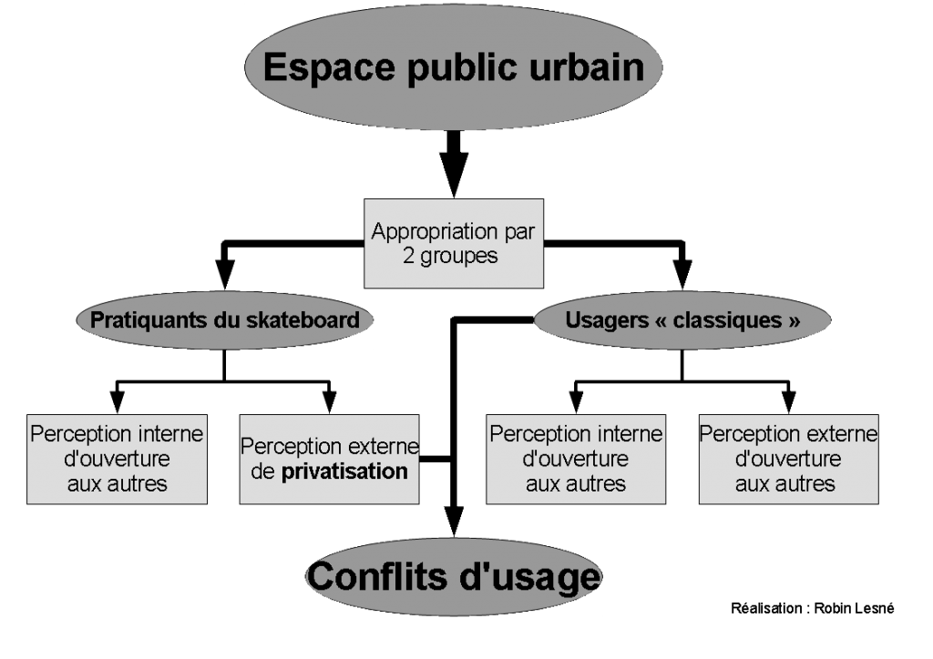 Cette non-correspondance entre la pratique et les normes sociales dominantes implique des tensions : des conflits d’usage dans l’espace en partage entre traceurs et autres usagers construits comme suit (Figure 6) selon l’exemple du skate-board à La Plata en Argentine (Savari et al., 2011) et une lutte pour l’acceptation sociale de l’activité par des négociations spatiales. Trois jeunes de 15-16 ans ont défendu, en vain, leur pratique et ont préféré partir pour préserver leur image (Observation O5) dans un conflit représentationnel dont les traceurs ont conscience : « les gens ont souvent leur référentiel : ils savent qu’eux ne sont pas capables de le faire donc estiment que c’est dangereux » (Observation O7). Mais la jeunesse influence grandement ces tensions puisque « quand t’es jeune, un adulte ne vient pas te parler comme il parlerait à un autre adulte, il te prend de haut et il est agressif » (Entretien AP1) et lors d’un contrôle policier (Observation O10), les traceurs âgés de 18 à 28 ans n’ont pas été dérangés.