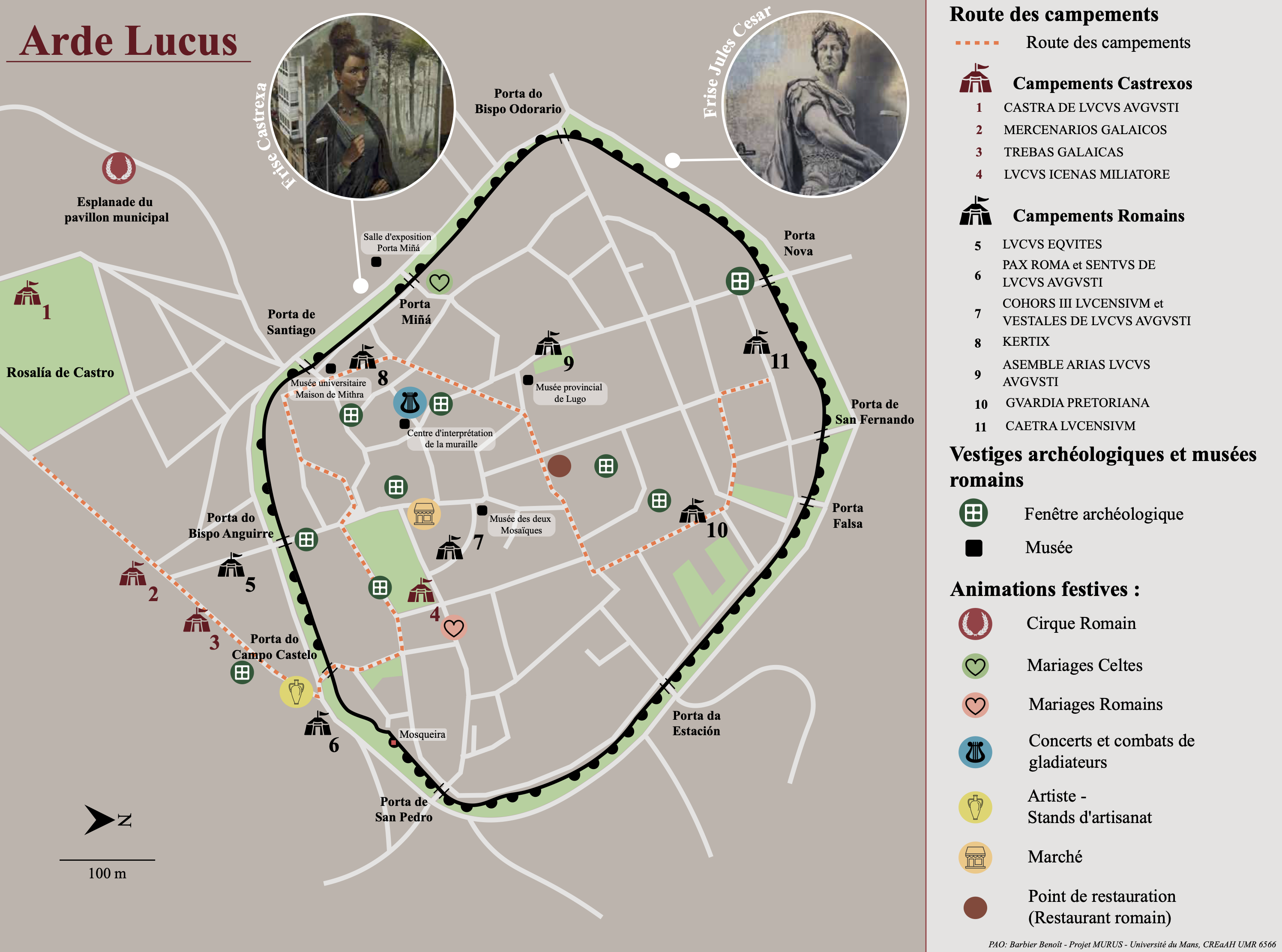 La ville de Lugo aime à rappeler aux visiteurs qu’elle est triplement inscrite à l’UNESCO, pour son rempart romain datant de la fin du IIIe siècle de notre ère (Inscription Unesco 2020), comme ville étape du Chemin de Saint-Jacques de Compostelle et pour sa cathédrale située sur ce même itinéraire de pèlerinage (Inscription Unesco 2009). De nombreux pèlerins passent en effet par la ville de Lugo avant d’arriver à pied dans la ville de Saint-Jacques-de-Compostelle située à une centaine de kilomètres. Néanmoins, c’est autour de la romanité que la ville de Lugo entend se démarquer de sa prestigieuse voisine, plus connue pour son pèlerinage chrétien. Le récit de la romanité est porté par les autorités de la ville et la Xunta de Galicia grâce à de nombreux vestiges romains, mis en valeur par des musées et centres d’interprétation aux alentours et dans la ville intra-muros de 34,4 hectares (voir figure 1). Parmi eux, c’est surtout l’enceinte romaine, large de 6 mètres et surplombée par un chemin de ronde qui frappe les visiteurs par sa monumentalité et sa reconnaissance internationale. La patrimonialisation des remparts romains, d’époque tardive (IIIe-Ve siècles), en dépit de leur importance aujourd’hui, n’a pas été facile, en raison leur caractère jugé massif et peu esthétique – le cas de l’enceinte romaine du Mans, entièrement décorée, fait figure d’exception. Les remparts romains, lorsqu’ils sont préservés en Europe, l’ont été parce qu’ils ont été longtemps invisibilisés par des habitats précaires, des entrepôts, ateliers, garages (Abel Vilela, 2011) situés contre les murs. Les remparts romains sont paradoxalement des marqueurs identitaires pour ces villes, tout en ayant été considérés pendant longtemps comme des obstacles à leur développement urbain (Bertrand, 2024). La narration autour de la romanité de la ville de Lugo s’appuie sur une patrimonialisation progressive des vestiges romains et une redécouverte de l’enceinte depuis près d’un siècle ayant entrainé des restaurations majeures des tours et des portions du mur endommagées. Elle est aussi célébrée, de manière festive, une fois par an depuis 2001, faisant rayonner la ville à une échelle nationale et internationale, comme un écho de l’inscription de 2000 et comme une appropriation post-inscription du rempart par ses habitants qui le considèrent comme scène essentielle et cadre de référence de la ville (enquête MURUS, 2023).