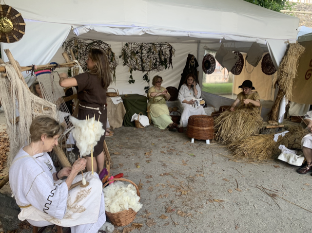 La participation des habitants dans les différentes fêtes de reconstitution historique, en Espagne notamment, est attestée par de nombreux chercheurs qui soulignent l’implication de plus en plus forte des locaux dans l’organisation de l’évènement (Belloso Martín, 2021). Nous en proposons ici une lecture à travers la cohésion sociale et l’émergence de véritables communautés patrimoniales engagées tout au long de l’année dans la fabrication de costumes mais aussi dans la reproduction à l’identique de gestes : tissages, luttes, combats, danses, chants, cuisine, recherche d’une authenticité dans les costumes, construction de camps en bois, de mobilier etc…. À l’image d’autres événements d’histoire vivante, les visiteurs et les participants abandonnent, pour une partie d’entre eux, leur rôle de simple spectateur pour participer, en se costumant et en participant activement aux défilés et aux activités proposées (Ibid., 2021). Le mot anglais de re-enacment, convoqué dans la littérature espagnole sur les patrimoines culturels et immatériels et l’histoire vivante (Fernandez-Ramos et al., 2022 ; Cortadella, 2011) résume à lui-seul cette posture d’acteur d’une histoire se réclamant d’une certaine rigueur historique. Le prestige de chaque association se mesure d’ailleurs à la véracité des costumes, à la qualité des tissus et des artefacts, au capital symbolique revendiqué pour légitimer leurs discours : « mon fils est historien, c’est le directeur d’un musée d’histoire. Nous nous sommes documentés pour améliorer les outils de tissage que nous utilisons ici. Vous voyez une reproduction d’un tissu qui est au castro de Villalonga, c’est un musée » (Entretien avec Marisol, Lugo, juin 2023). Marisol, du centre d’artisanat de Lugo, organise un défilé de mode romaine lors de sa première participation à Arde Lucus en 2019, « nous faisons un travail de recherche sur le terrain, dans les musées, toujours. Nous avons presque une ligne de recherche ! Nous sommes assez rigoureuses, nous copions exactement les motifs… » (Ibid., 2023).