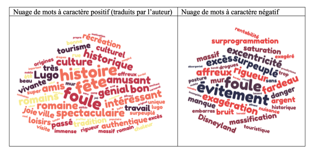 3. Nuages de mots issus de l’enquête de 149 répondants (2023) montrant les caractères positifs et négatifs de l’événement Arde Lucus aux yeux des habitants et des visiteurs de passage. (Enquête, 2023, traduits par Elodie Salin)