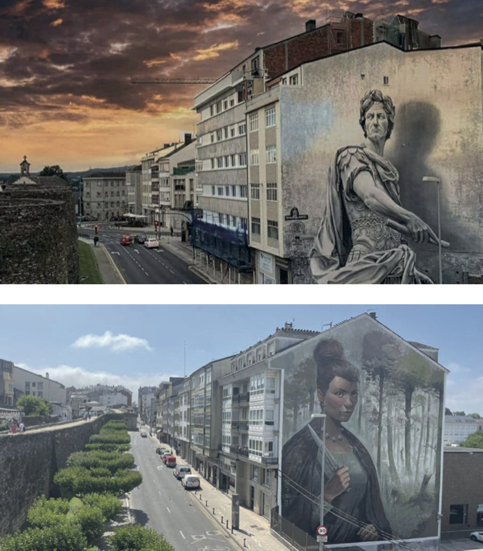 5. Le mural de César (en haut), haut de 20 mètres, a été peint en 2021 par Diego As, champion d’Espagne de graffiti et a permis une certaine visibilité internationale car il a été élu meilleure œuvre par la communauté internationale Street Art Cities (@streetartcities) en 2022 (Concello de Lugo, 2021). La guerrière castrexa par Manuel Pallín est plus récente (2023).