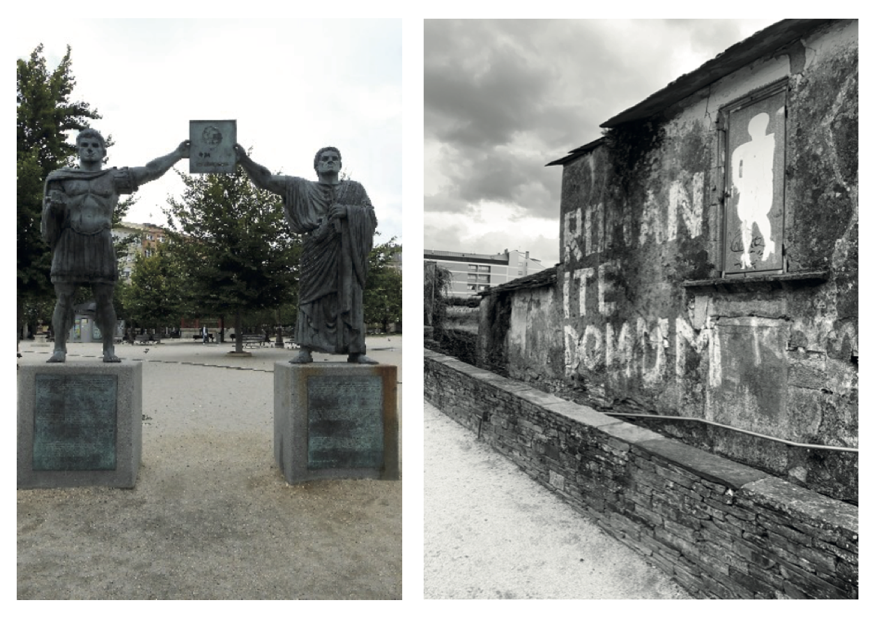 7. À gauche : statues de Ramón Conde (2006) représentant les fondateurs de la ville de Lugo, Auguste et Paulus Fabius Maximus sur la place centrale de Lugo ; à droite : Romani ite domum, graf en latin que l’on pourrait traduire par « Roman, go home », inscrit sur une maison abandonnée donnant sur le chemin de ronde de l’enceinte de Lugo faisant référence à la fois au film des Monty Python La vie de Brian (1979) et aux slogans tourismophobes des villes touchées par le surtourime (E. Salin, 2022)