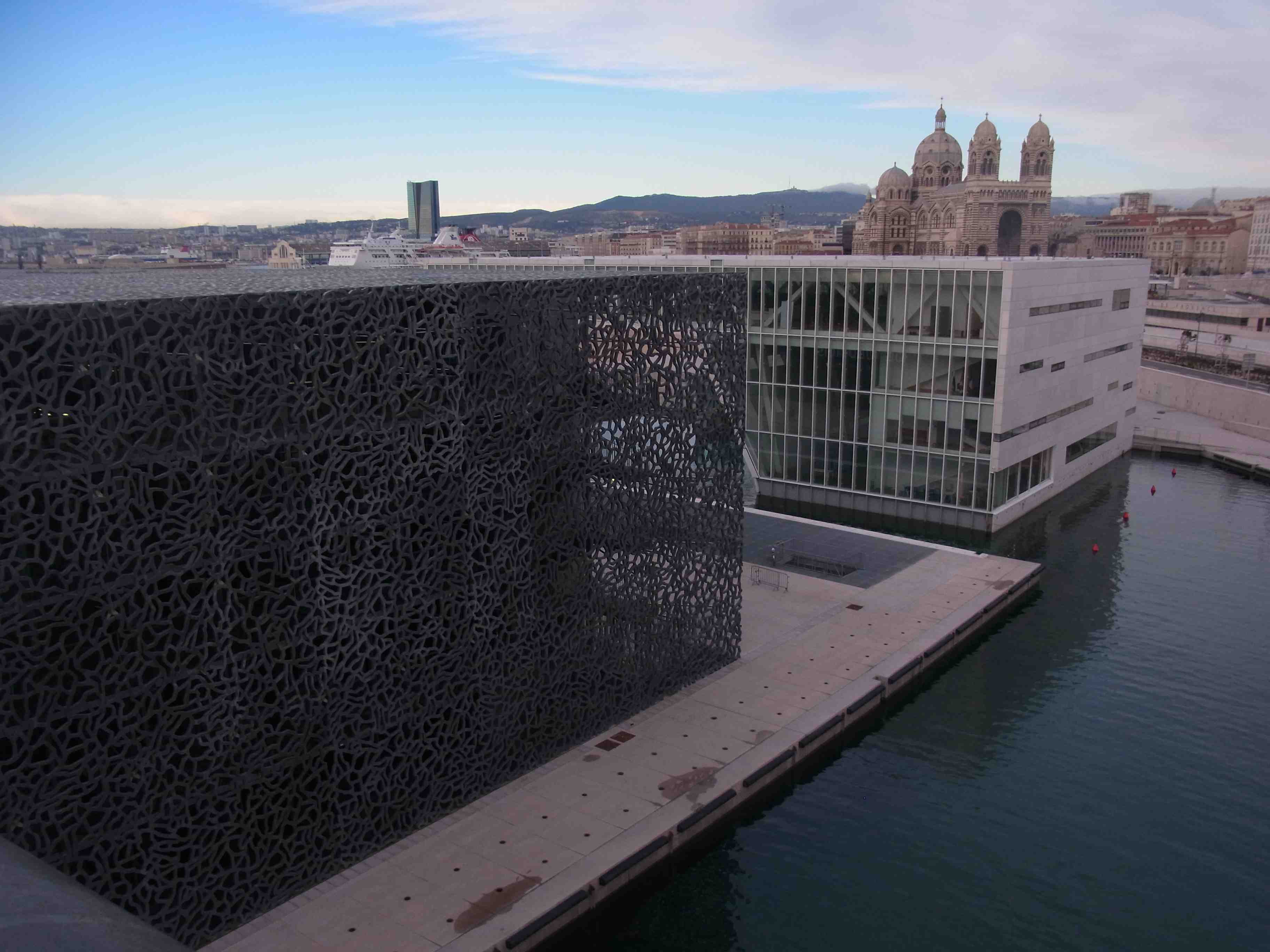 Le MuCEM par l’architecte français Rudi Ricciotti (avec en arrière-plan la tour de la CMA CGM et la cathédrale Sainte-Marie-Majeure) (Mondou, 2014)