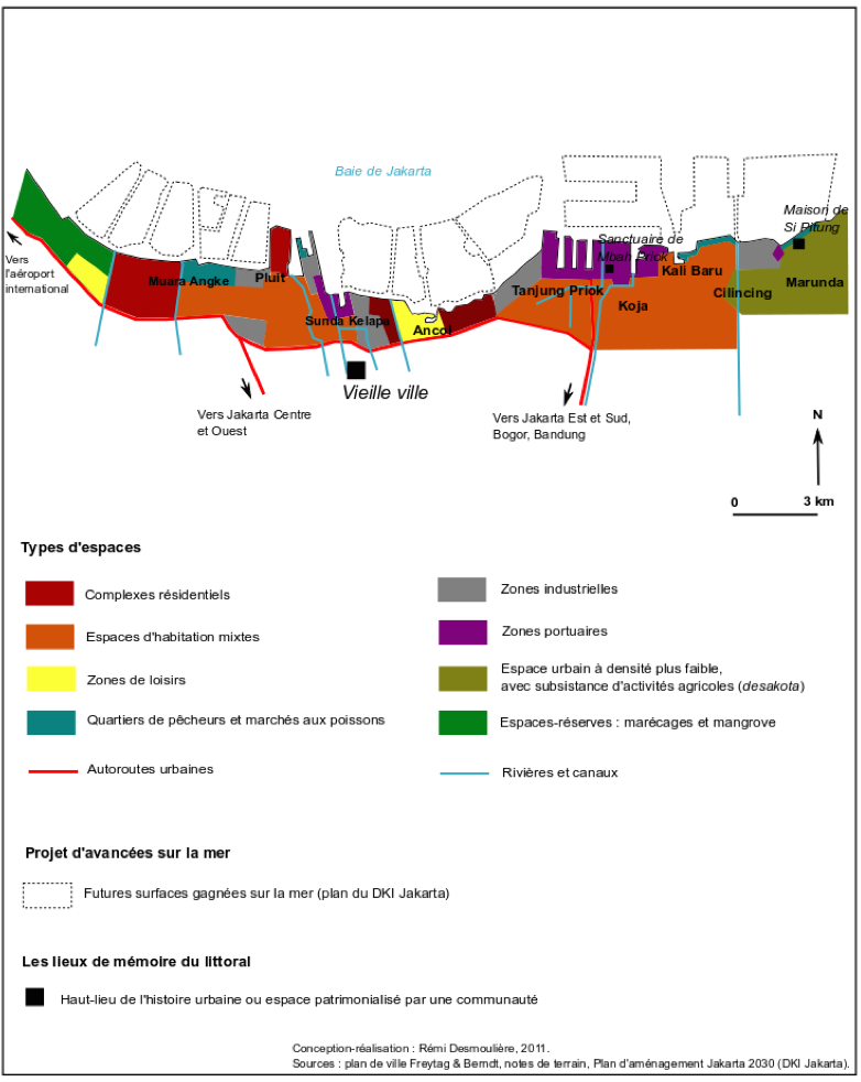 La notion d’interface ville-port, dont l’usage s’est répandu à partir des années 1980 (Hayuth, 1982, 2007, Ducruet, 2008), fournit un cadre théorique permettant de penser ensemble la rupture et la continuité qui caractérisent la relation paradoxale qu’entretiennent espaces urbains et portuaires à l’échelle locale. En effet, l’interface se présente à la fois comme une limite et un espace ayant sa propre organisation (Lévy, 2003 : 522). Toutefois, l’utilisation de la notion d’interface ville-port reste généralement axée sur la problématique de la reconversion des friches laissées par le transfert des activités portuaires en périphérie (Hoyle, 1997, Ducruet, 2005). À Jakarta, les cas d’expulsions nous donnent à voir d’autres modalités de fonctionnement de l’interface ville-port : à travers eux, il devient possible d’analyser la manière dont s’expriment la concurrence pour l’espace au contact entre ville et port, ainsi que les stratégies développées par les acteurs de part et d’autre, mais aussi au sein de l’interface, pour réguler et contrôler cette concurrence.