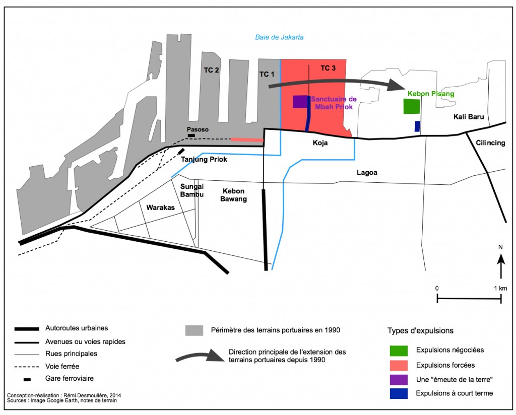 Cet article propose donc d’analyser les expulsions comme un révélateur des modes d’organisation et des dynamiques de cet espace d’entre-deux que constitue l’interface ville-port. Il se fonde sur un travail de terrain mené entre février et mai 2011 dans les quartiers riverains du port de Tanjung Priok. Des entretiens1 menés avec les différents types d’acteurs de l’interface, principalement des habitants, des fonctionnaires de plusieurs niveaux d’administration et des cadres du principal opérateur portuaire, l’entreprise nationale PT Pelindo II, représentent la principale source d’informations, complétée par une recherche bibliographique, l’analyse d’archives de presse et des observations de terrain.