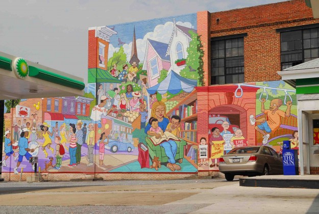 4. Mural de Tom Chalkley (3313 Greenmount Avenue), 2010. (http://www.baltimoresun.com/entertainment/bal-baltimores-50-coolest-murals-pictures-20120807,0,4770287.photogallery). L’artiste insiste sur l’esprit de quartier qui règne dans une rue animée par une population multi ethnique qui se retrouve au marché pour consommer les produits agricoles des jardins communautaires; il fait référence aux symboles culturels traditionnels de Baltimore: le crabe de la baie de Chesapeake, l’équipe de base-ball des Orioles. L’implication civique et l’empowerment passent aussi pas la participation électorale).