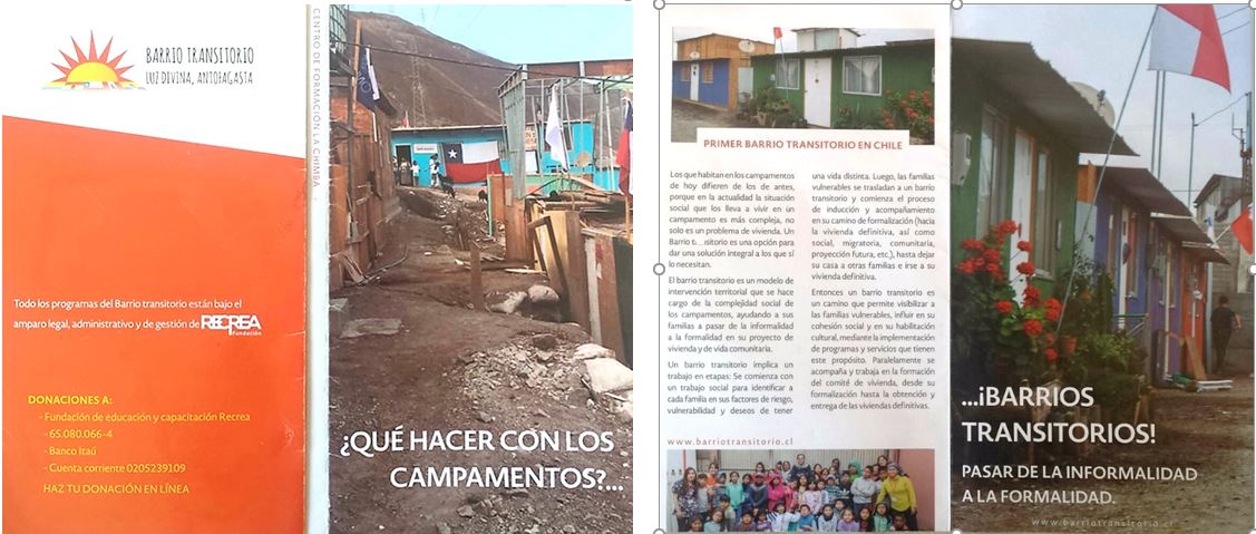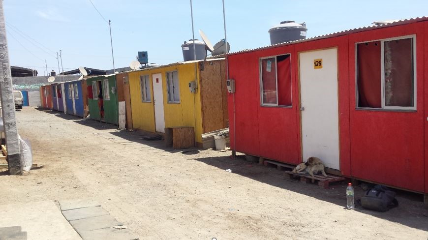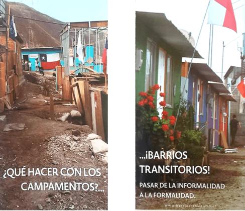 Pour justifier le délogement d’une partie des habitations, les autorités régionales ont fait valoir la présence d’un risque environnemental d’ordre technologique, déplaçant ainsi des habitant·e·s dans un « quartier transitoire » (« barrio transitorio »). Il s’agit d’un dispositif d’hébergement d’urgence aux conditions d’habitat élémentaires, d’ordinaire destiné aux personnes sinistrées de catastrophes naturelles. Dans le « quartier transitoire », un curé jésuite et une fondation spécialisée dans l’intervention socio-éducative mettent en place un dispositif d’encadrement inédit dans le pays, qu’ils décrivent comme une « étape nécessaire d’adaptation » pour que soit assimilé un supposé mode de vie de la société chilienne, jugée « plus avancée ». Le « quartier transitoire » vise dans le même temps à rétablir un ordre déstabilisé par les campamentos : celui du marché foncier et de la politique chilienne de logements, qui attribue aux ménages les plus pauvres des logements construits à faible coût, dans des secteurs urbains périphériques.