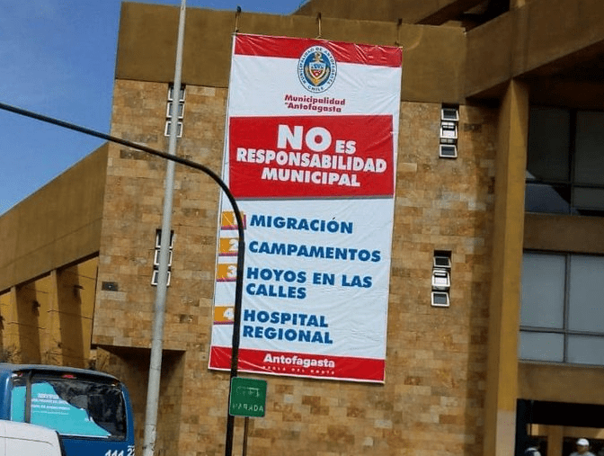 Ces derniers deviennent un sujet particulièrement problématique pour les responsables politiques locaux, majoritairement issus d’une droite conservatrice qui évoque l’immigration surtout à travers le prisme sécuritaire. En atteste la pancarte affichée en 2019 par la Mairie d’Antofagasta sur sa façade : elle énumère une liste de thématiques, considérées comme sources de problèmes pour la collectivité, en affirmant qu’elles ne relèvent « pas de la responsabilité municipale ». Avant l’hôpital régional (surchargé) et des trous dans la chaussée, figurent la migration et les campamentos.
