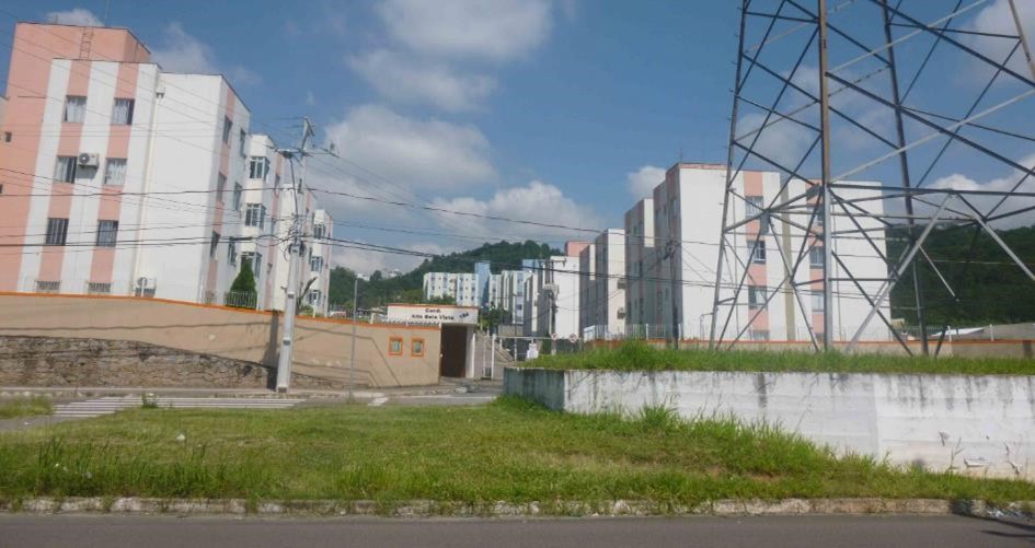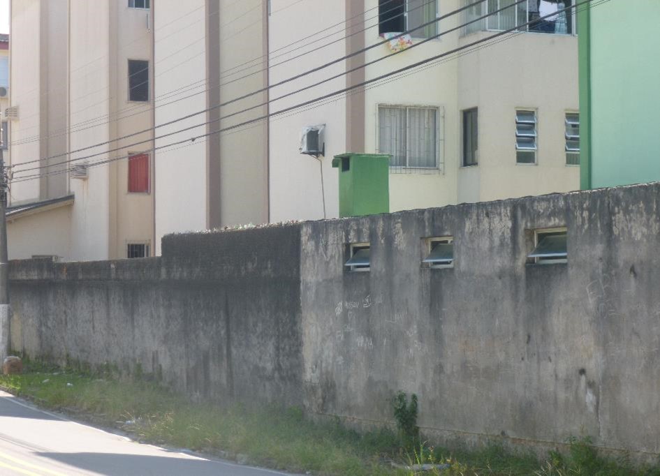 Enfin, certains ensembles, bien que relevant de politiques de logement social, présentent des caractéristiques d’un plus haut standing, avec une fermeture et une surveillance plus manifestes. Par exemple, les murs qui entourent le Residencial Villas do Arvoredo (São José) atteignent 3,5 mètres sur les côtés et l’arrière, surmontés d’une clôture électrique d’un mètre de haut, comme indiqué sur le schéma ci-dessus. Le Recanto dos Sonhos (Palhoça), visible sur les photographies ci-dessous, présente les mêmes équipements, qui marquent la séparation d’avec le quartier.