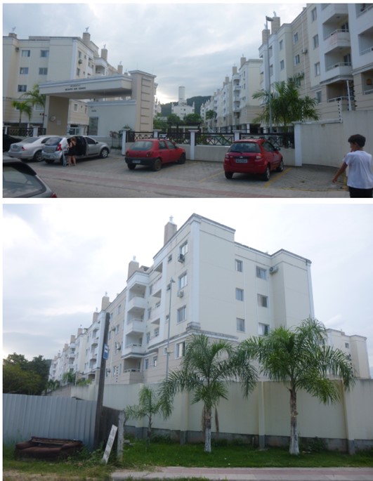 Les résidences fermées et sécurisées pour populations modestes sont plus centrées sur l’habitat, comme le révèle l’analyse du discours publicitaire sur les projets immobiliers liés au PMCMV. On peut discerner toute une gradation de modèles, dont seulement les plus chers prévoient des équipements de divertissement. Les résidences qui s’adressent plutôt aux classes moyennes basses, comme Villas do Arvoredo (São José), comprennent une salle de gymnastique, parfois une piscine, presque toujours des balançoires et jeux pour enfants, une salle de réception et un barbecue. Dans les quartiers fermés les moins chers, les équipements collectifs se résument à un barbecue et parfois à un toboggan pour les enfants, comme dans le Residencial Portal do Sol (Biguaçu). Certains sont juste un groupe d’immeubles, ceints d’un mur, sans plus d’équipements de loisirs, comme le Residencial Solar dos Araças (Palhoça) ou le Villagio Campo Bello (Biguaçu).