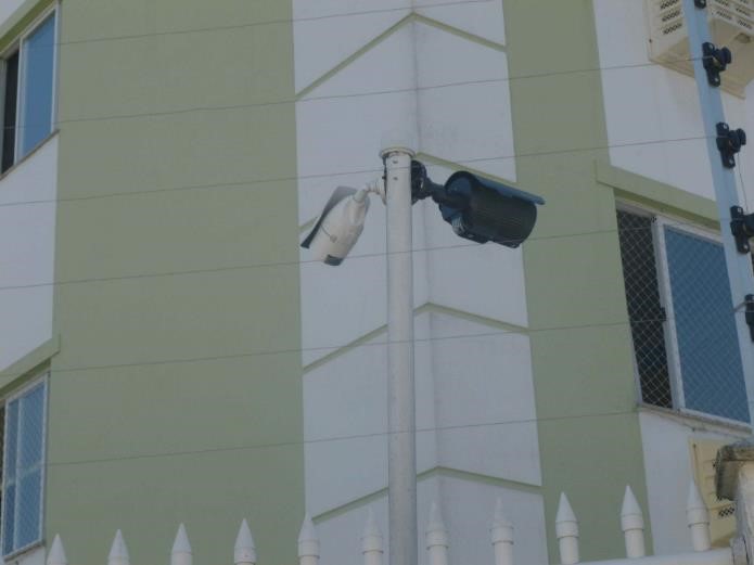 12. Sur ce détail de la résidence Villa Açoriana, à São José, on remarque qu’en plus des caméras de surveillance et des murs et grilles surmontés d’une clôture électrique, les ménages habitant au premier étage ont grillagé leurs fenêtres (autrice, 2016).