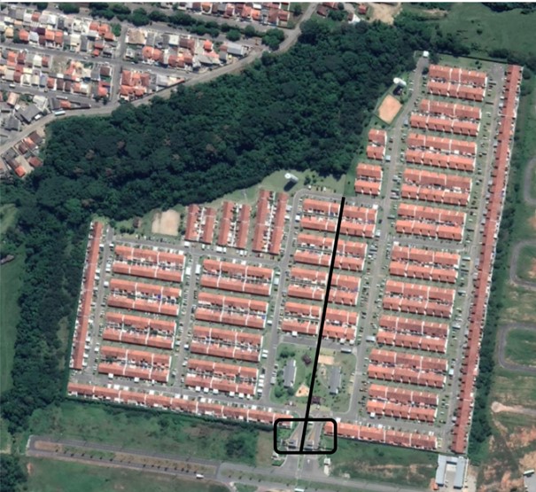 13. Sur cette photographie prise par satellite (issue de Google Earth, consulté en avril 2021), on peut observer les deux ensembles Moradas de Palhoça 2 et Moradas de Palhoça 3. J’ai encadré les entrées (en bas) et indiqué par un trait noir la séparation entre les deux ensembles.