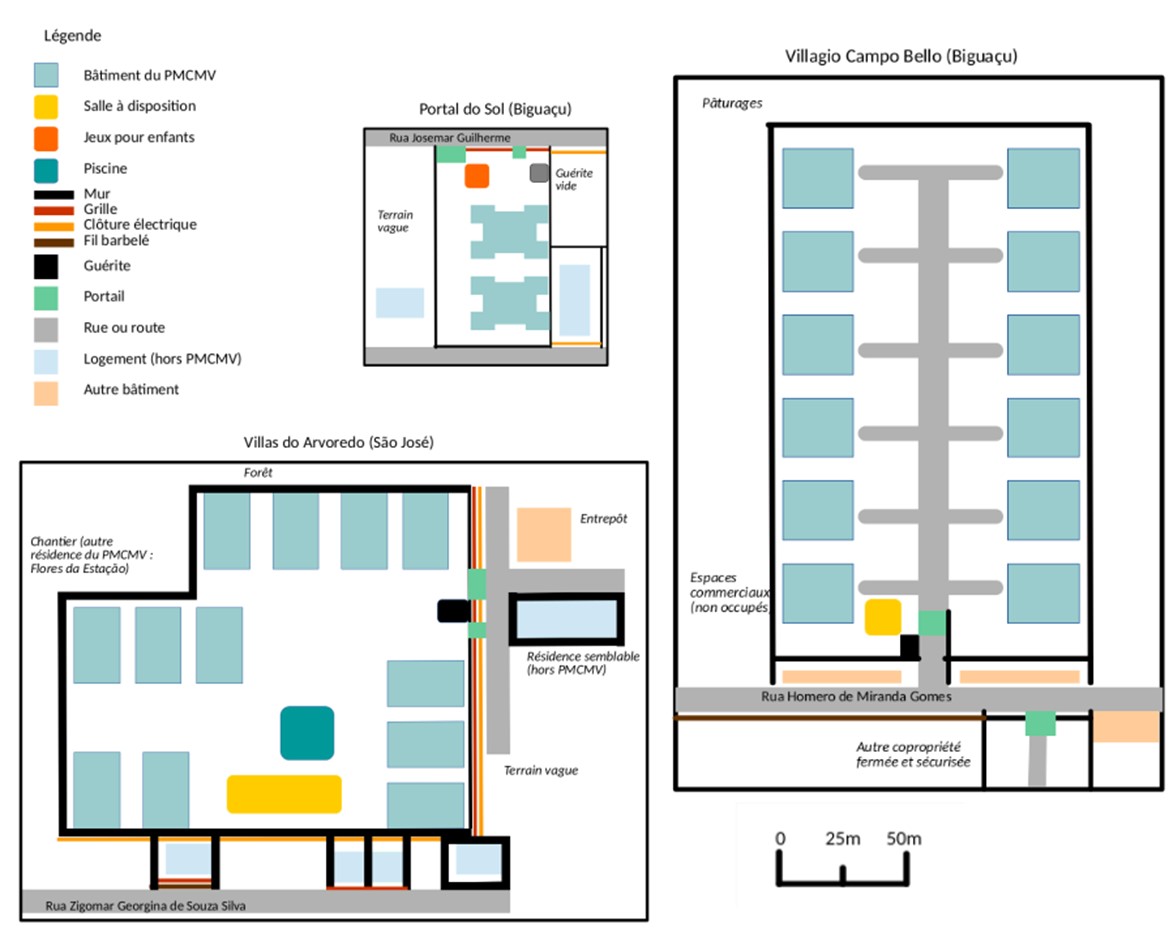 Les caractéristiques partagées avec les résidences fermées et sécurisées aisées sont suffisantes pour affirmer qu’il s’agit du même modèle, mais il n’est pas transposé, il est traduit et adapté. Les copropriétés fermées du PMCMV se différencient des condominios fermés riches par les paysages urbains créés, les matériaux de construction, les formes architecturales, ainsi que par les fonctions et équipements disponibles, les pratiques des ménages et les motifs qui ont poussé à l’adoption de la forme fermée et sécurisée, du côté des pouvoirs publics comme des entreprises immobilières.