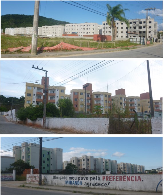 Les entreprises de construction ont choisi, pour les ensembles neufs, des formes très standardisées. Il peut s’agir soit d’un grand nombre de petites maisons, disposées selon un plan en damier, soit d’un ensemble d’immeubles, là aussi disposés de façon rectiligne, comme on peut le voir sur les schémas ci-dessus. La plupart des immeubles comprennent trois étages au-dessus d’un garage, le maximum autorisé par la législation brésilienne sans mettre d’ascenseur. L’architecture est rectiligne et peu originale. Cet aspect est souvent perçu comme un grand défaut du logement social, alors que les maisons populaires font l’objet de beaucoup de décoration et d’aménagements intérieurs et extérieurs afin de les personnaliser (Batista, 2015). Par rapport aux autres logements modestes comme par rapport aux résidences aisées, les formes sont plus standardisées.
