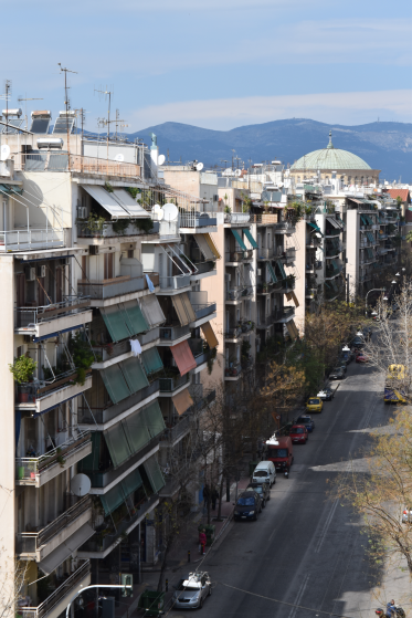 1. Vue sur la rue Acharnon et le dôme de l’église A. Panteleimonas depuis le balcon d’une chambre du City Plaza, (A. Bedard, 2017)