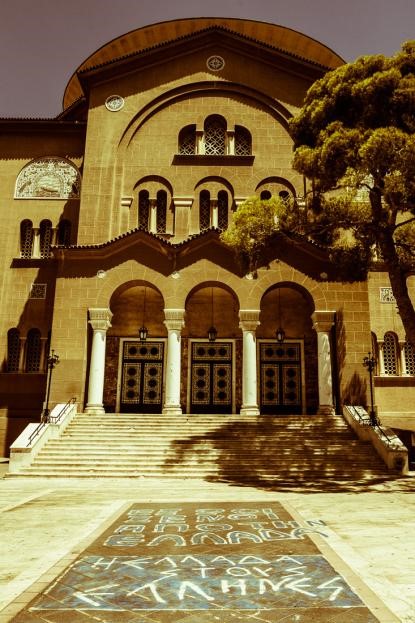 2. Devant l’Eglise d’A. Panteleimonas, des inscriptions, effacées depuis, témoignent d’une volonté d’exclure les migrants de l’espace public. « Dehors les étrangers », « La Grèce nous appartient ». (Alberto Campi, 2012)