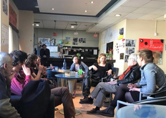 Cette stratégie est le résultat d’un choix de visibilité et d’ouverture pour fonctionner en symbole politique. Cela permet d’attirer des bénévoles « solidaires internationaux » ou des dons (souvent par le relais d’organisations politisées en Europe), et d’obtenir un soutien massif en cas de menace d’éviction. Une communication interne au squat est mise en place et se décline en plusieurs aspects. D’une part, les journalistes sont acceptés et accueillis, contrairement à la plupart des squats assez fermés aux médias. Ils doivent cependant respecter certaines règles, comme celles de rester dans les espaces communs de l’hôtel et de monter aux étages uniquement s’ils sont accompagnés d’un local ou d’un bénévole, pour éviter des intrusions dans l’intimité des résidents. Le lieu fait l’objet de nombreux reportages, de documentaires et d’articles, qui assurent sa légitimation. Des étudiants ou des chercheurs en sciences sociales toujours plus nombreux s’y rendent pour y mener une recherche ; il attire aussi des figures tutélaires de la pensée radicale (Fig 5) telles qu’Alain Badiou, Judith Butler, David Harvey ou plus récemment Angela Davis, qui viennent le visiter et y faire des interventions.