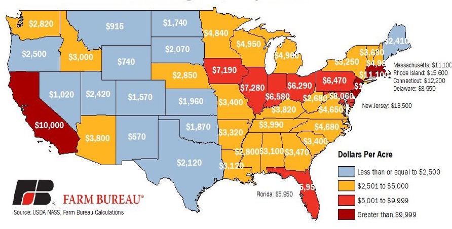 1. Les prix moyens du foncier agricole par État aux États-Unis, la moyenne nationale étant de 3160 $ par acre((Un acre équivaut à 4 046 m2, soit approximativement 0,4 hectares. Il faut donc 2,5 ares pour obtenir un hectare.)) (source : Farm Bureau, Land Value, 2019).