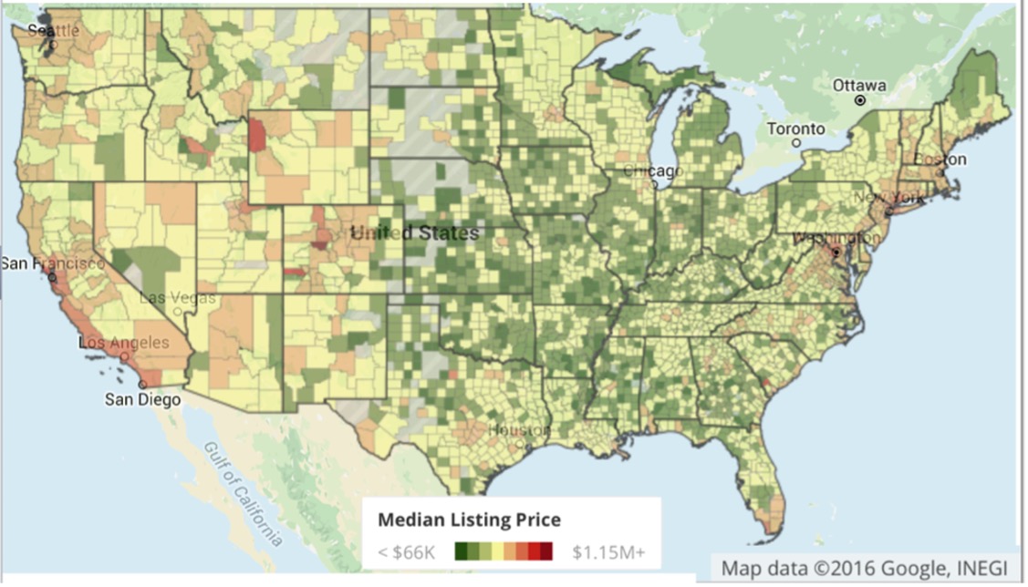 2. Prix médians des logements par comté aux États-Unis (source : Trulia – Geocurrents, 2016).