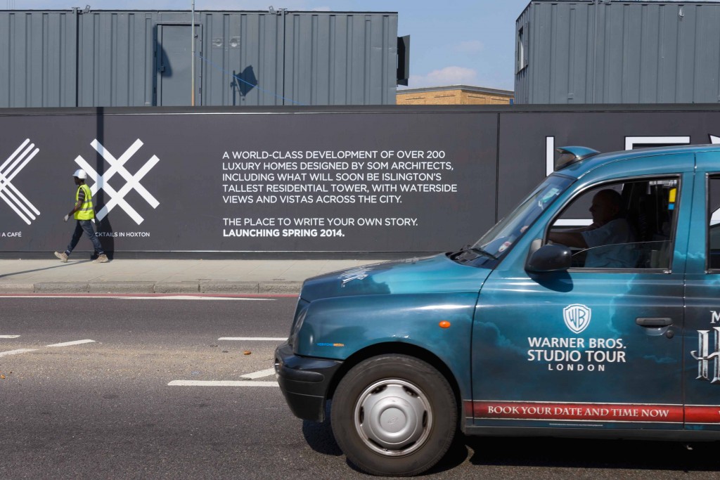 L’ancienne centrale thermique de Battersea et slogan de la promotion immobilière, Vauxhall Nine Elms (Appert, 2014)