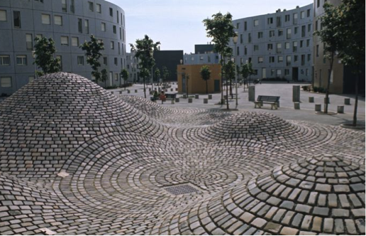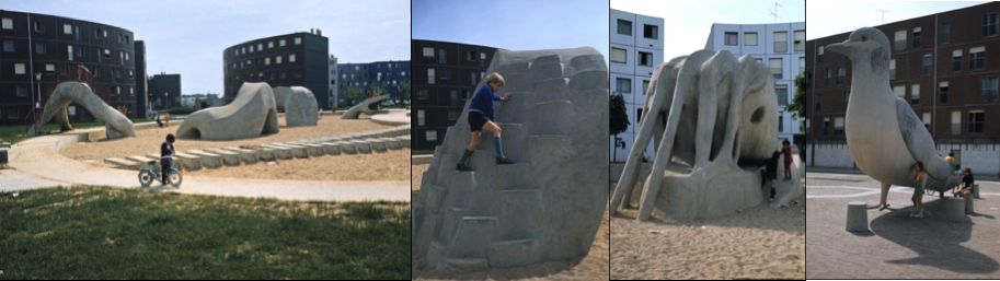 - Dans la même veine iconoclaste et poétique, Émile Aillaud (1902-1988) réalise entre autres le quartier Pablo Picasso à Nanterre et les Courtilières à Pantin. Aillaud imagine des bâtiments, tiges végétales en forme de labyrinthes, qui s’élèvent entre arbres plantés et nuages dessinés. [↩]