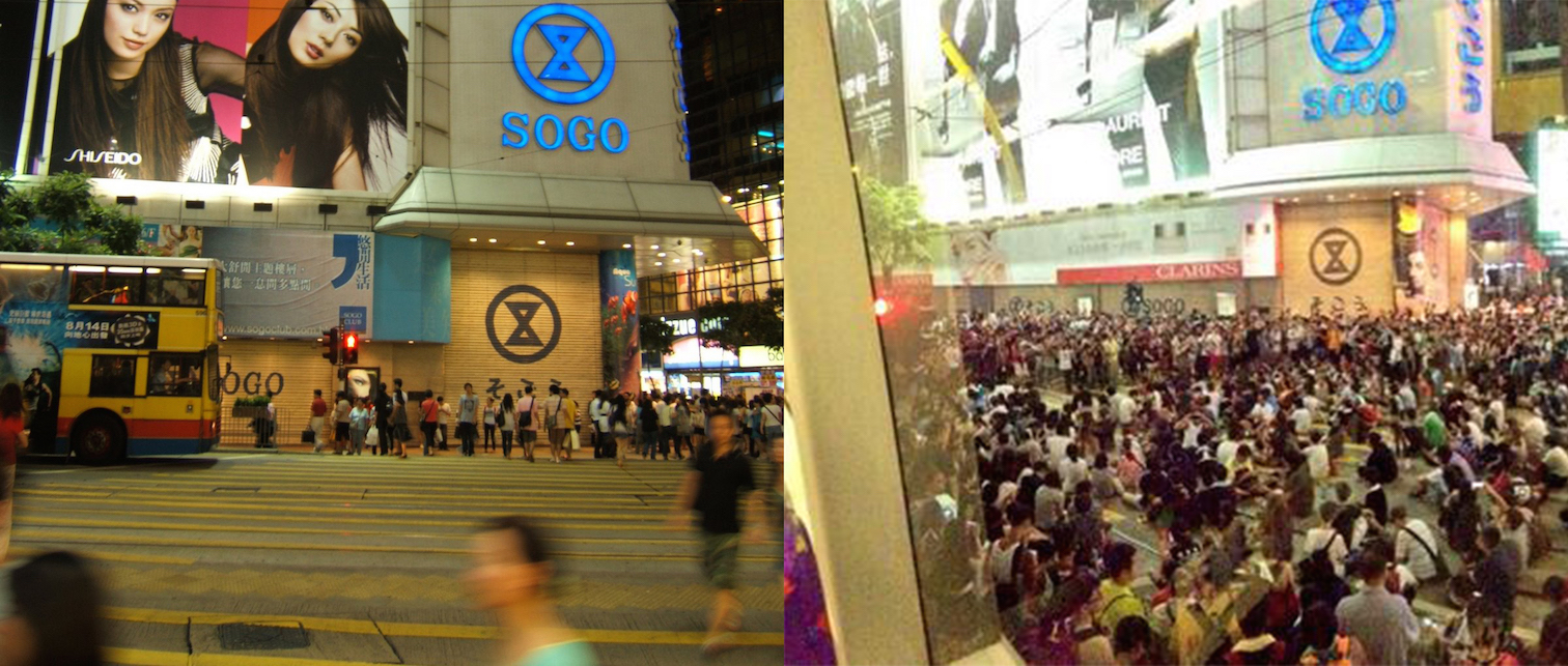 4. À gauche le Sogo Crossing, un « Shibuya Crossing » hongkongais (Rouiaï N., 2008) / à droite le Sogo Crossing occupé par les manifestants en septembre 2014 (Chow V., 2014)