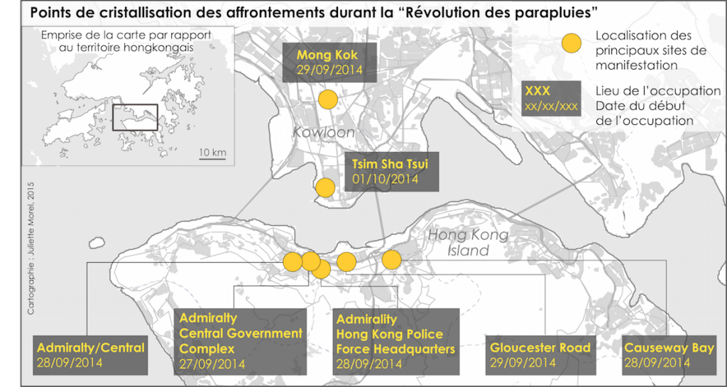 Il y a un an, Hong Kong occupait l’espace médiatique international. La « Révolution des parapluies » – telle qu’elle a été baptisée par les médias puis réinvestie par les manifestants eux-mêmes – détonnait par son ampleur, son caractère inédit et sa photogénie. Ici, dans cette enclave de 1 104 mètres carrés, au cœur de cette métropole ultra-compétitive, dans les avenues de cette icône urbaine portée en étendard par le gouvernement de Pékin comme l’incarnation d’une Chine dynamique, jeune et attractive, des milliers de manifestants, armés de leurs parapluies pour contrer les gaz lacrymogènes des autorités, bravaient la République Populaire de Chine (RPC) pour préserver et renforcer la démocratie. Aujourd’hui Hong Kong a disparu des radars médiatiques, ne revenant sur le devant de la scène qu’à l’occasion de certains articles rappelant son statut de ville où l’immobilier résidentiel est le plus cher au monde. Qu’en est-il réellement de la situation hongkongaise un an après ce large mouvement populaire ? Que s’est-il passé durant ces mois de manifestations dans les rues, avenues et boulevards hongkongais, alors totalement immobilisés, où les flux s’étaient brutalement arrêtés ? Quelles marques la « Révolution des parapluies » a-t-elle laissé dans l’espace urbain hongkongais ? Un retour sur ces manifestations et leurs prémices nous permettront de jeter un regard englobant sur une situation politique et un espace urbain particuliers. Ce retour nous permettra enfin de mieux interroger la situation actuelle à Hong Kong, entre stagnations, espoirs déçus et craintes pour l’avenir.
