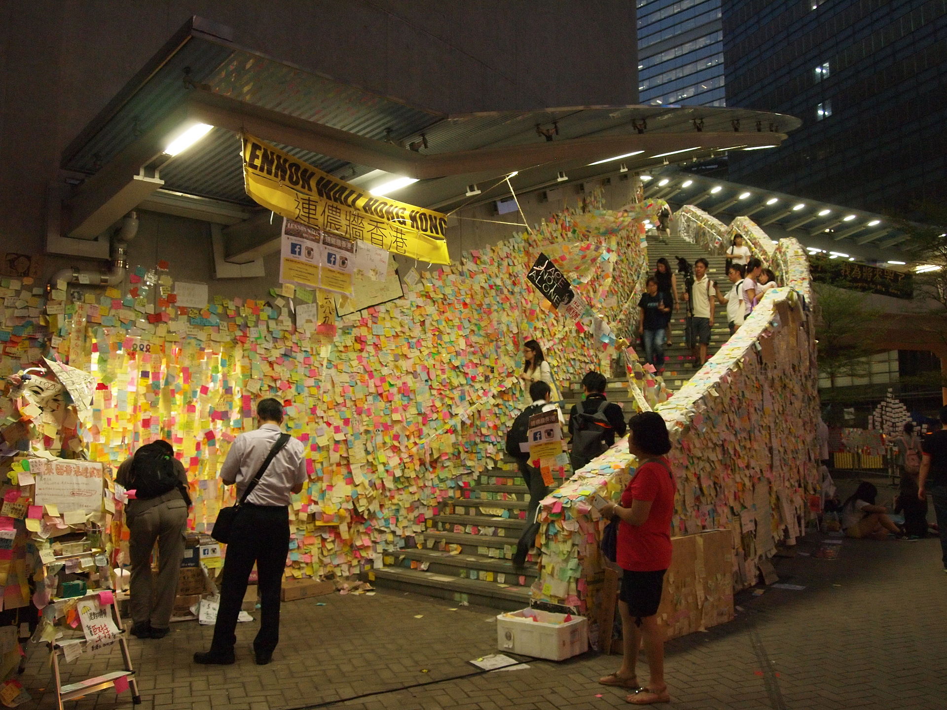 Plusieurs mois après la fin des manifestations, les parapluies restaient pourtant ouverts sur les murs entourant le Quartier Général de l’exécutif hongkongais : le Lennon Wall, et ses milliers de post-it multicolores à teneur politique, conservait la mémoire du combat politique mené sur le sol de la RAS.