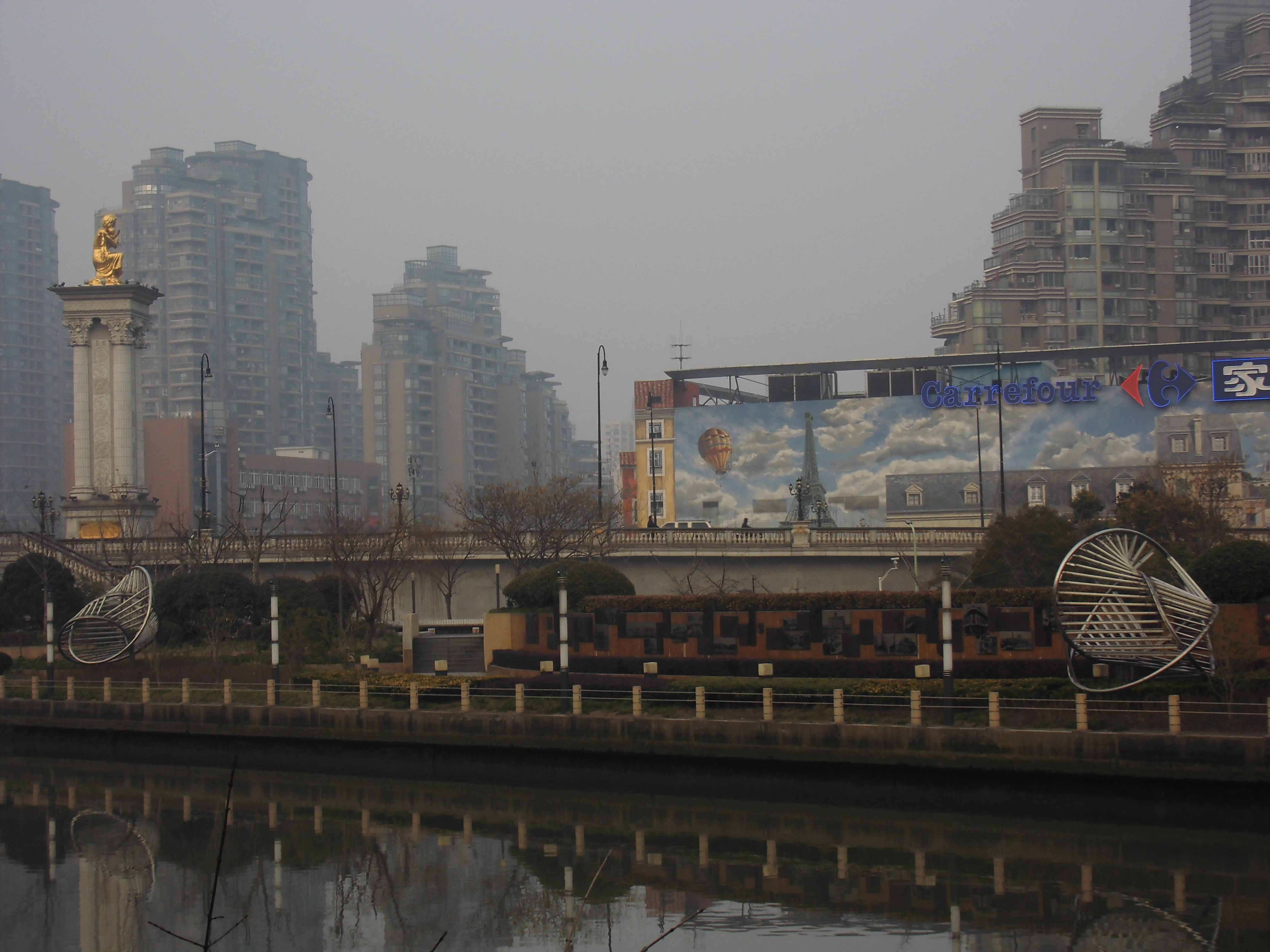 L’entreprise Carrefour qui s’est installée dans un entrepôt adjacent du pont Wuning Lua fait appel aux services de l’entreprise française « CitéCréation » pour réaliser en 2008 « le plus grand trompe-l’œil du monde » : sur les 5000 m² de façades du mall,on voit un décor de Paris, avec ses lieux iconiques (Tour Eiffel, Notre Dame de Paris, etc.). La monumentalité de la fresque fait écho aux leitmotivs du projet de régénération urbaine : internationalisation,embellissement, création de repères paysagers (ici un emboitement de paysages, visible de loin et facilement reconnaissable), mais aussi modernisation (le centre commercial Carrefour jouant aussi indirectement un rôle de symbole de l’avènement de la société de consommation).