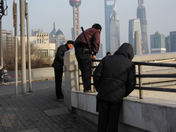 Certains quartiers des districts que traverse la rivière – Jing’an, Zhabei–sont encore en marge du redéveloppement de la Suzhou. Les tours résidentielles, modernes et « confortables » y sont plus rares. On peut parfois y observer des « dents creuses », reconverties en logements informels. Ailleurs, ce sont des pratiques étonnantes qui témoignent de la vitesse des changements, voire du caractère un peu artificiel de la nouvelle peau de la Suzhou. On est loin de la population créative mise en avant par la municipalité dans sa promotion de la Suzhou. La régénération est loin d’être uniforme dans le temps et dans l’espace ; elle s’adresse à une nouvelle classe moyenne, et exclut bien souvent les anciens riverains ou les migrants (mingong)  lesquels représentent pourtant les chevilles ouvrières du chantier.
