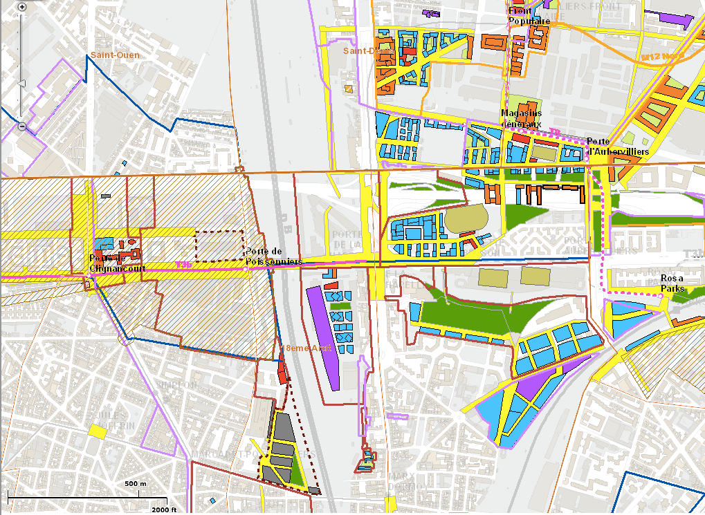 Les deux camps, zones exceptionnelles, s’intègrent dans des territoires préalablement ou programmatiquement zonés. La ville de Grande-Synthe, enfant des Trente Glorieuses, est entièrement sectorisée. Le camp de la Linière s’intègre à cette organisation sans la bousculer ; il en semble plutôt une énième réfraction, entre zone industrielle et infrastructures de transports – ce qui le rattache, paradoxalement, aux fonctions urbaines essentielles au développement urbain moderne. A Paris, la multiplication des projets urbains à l’intérieur du GPRU donne au quartier, dans les plans de programmation, l’aspect d’une mosaïque chamarrée où le camp passerait inaperçu – s’il était figuré.