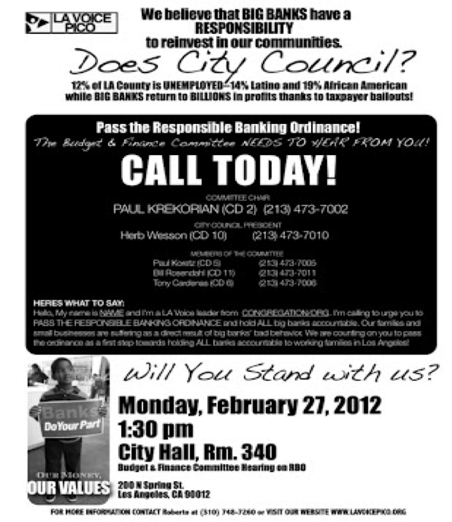 Un exemple intéressant est celui de la régulation des activités bancaires à Los Angeles (voir fig. 1). C’est une campagne qui a eu lieu suite à la crise de 2008 et des foreclosures. L.A. Voice se dit qu’il faudrait se mobiliser là-dessus, mais se rend compte que ses membres ne sont pas directement touchés au départ car souvent locataires. À partir de 2010, cette question resurgit car la population est touchée par la deuxième vague des foreclosures, de même que les commerces des quartiers pauvres ont du mal à obtenir des prêts pour financer leurs activités. Une demande sociale émerge à ce moment-là parmi les membres de l’organisation, ils lancent donc une campagne. Mais on peut considérer que cette demande sociale a aussi été en partie construite par le directeur de l’organisation, qui a senti qu’il y avait une opportunité à se saisir de cet enjeu. L’objectif est simple : s’assurer que les banques qui travaillent avec les institutions n’aient pas de pratiques financières « prédatrices » et notamment qu’elles investissent dans les quartiers pauvres et prêtent des fonds à leurs habitants. Au-départ, le conseil municipal ne réagit pas et la campagne ne marche pas du tout ! Mais à l’automne 2011, le mouvement Occupy Wall Street émerge, ce qui va changer la donne : il y a même un Occupy L.A. qui s’organise et la question des inégalités financières devient un enjeu important. Le changement de contexte national et local va permettre à cette revendication au faible écho d’être beaucoup plus médiatisée, d’obtenir davantage de soutien de la part d’autres organisations. Ainsi, alors qu’il y était initialement opposé et après des mois de pression, le conseil municipal de Los Angeles vote le Responsible Banking Ordinance en avril 2012, qui impose aux banques qui travaillent avec la Ville (pour des chantiers municipaux par exemple) de respecter un cahier des charges éthique, c’est-à-dire d’investir dans les quartiers pauvres et d’accorder des prêts à des habitants de ces quartiers faiblement solvables. C’est un enjeu historiquement important pour le développement économique des quartiers pauvres aux États-Unis.