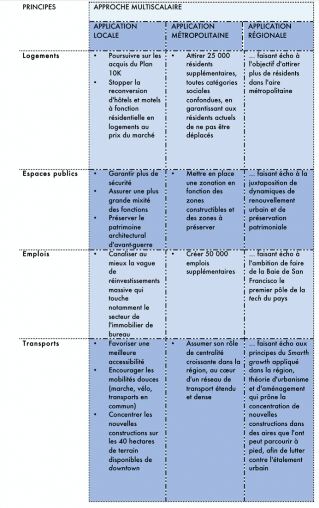 Les techniques de travail de SPUR sont héritées du tournant participatif des années 1980 : petites équipes de travail collégiales, consultation régulière de tous les acteurs de l’aménagement de la région mais qui sont extérieurs à l’agence. Cela concorde avec le fait que le gouvernement de la ville soit actuellement en train de préparer son sixième Neighborhood Specific Plan pour le centre-ville. Ce plan est important car il doit déterminer par exemple la part de foncier allouée à des surfaces de bureaux, à des fonctions commerciales, ou encore la part de futures unités de logement aux prix du marché et celle du logement social. Si ce projet cible avant tout le downtown, il est clairement inscrit dans un effort d’aménagement régional, et traduit une conviction (de la part de SPUR, mais aussi des décideurs locaux et régionaux impliqués) de la centralité retrouvée d’Oakland. Cela peut être résumé par le tableau suivant, qui souligne combien les ambitions d’aménagement de SPUR pour le downtown se font avant tout l’écho de directives à l’échelle métropolitaine et régionale. Ces principes ont déjà été formulés dans d’autres plans locaux. De ce fait, parler du tournant d’Oakland, c’est aussi s’interroger sur le degré d’innovation des plans d’aménagement actuels : peut-on ici parler d’alternatives aux propositions formulées par le gouvernement local ? La collaboration entre acteurs des trois villes, sans segmenter la région métropolitaine, constitue-t-elle une innovation viable, et surtout faisable ?