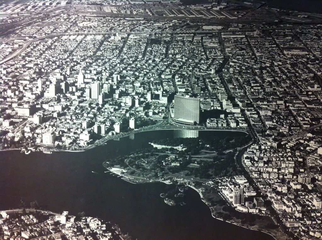 3. Photographie aérienne ancienne d’Oakland, exposée à l’intérieur de l’Hôtel de Ville (Maaoui, 2014)