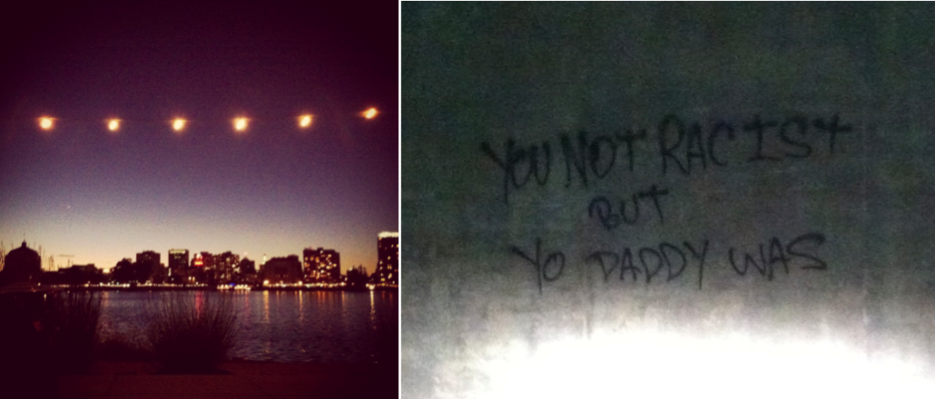 7. Bords de Lake Merritt, une destination nocturne animée au cœur de la ville – Tag sur un mur à proximité du lac (Maaoui, 2014)