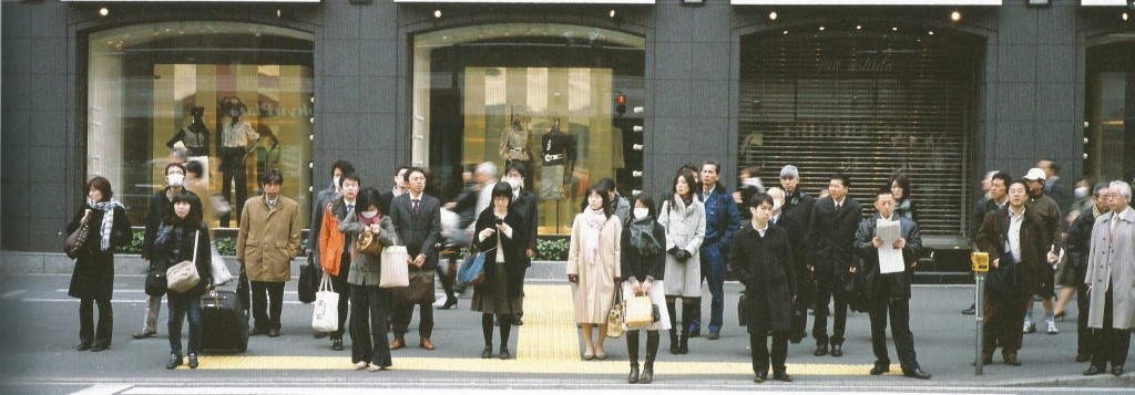 L’expérience de l’attente pourra s’avérer très différente selon que l’on soit en pleine forme, épuisé ou malade, familier du lieu ou étranger à celui-ci, conscient de ce qui se passe autour de soi, attentif, ou replié dans sa bulle, plongé dans ses pensées. Une attente routinière sur le chemin du travail ne revêtira pas le même sens que l’attente qui précède le départ en vacances. Attendre longuement et seul sera probablement plus désagréable qu’attendre un temps (très) bref, en compagnie d’amis, ce qui est de nature à changer la signification qui est attribuée à l’attente. L’ouvrage donne aussi à voir les regards et le rite de l’évitement sur lesquels Erving Goffman (1973, 1974) a tant écrit, ainsi que le jeu délicat par lequel on cherche à se maintenir à une distance suffisante des autres, la proxémie chère à Edward T. Hall (1971). Les situations mises en avant offrent à voir une multitude de détails, y compris en arrière-plan, qui attirent l’attention, parfois dans un deuxième temps. De nombreux contrastes sont mis en avant, parfois accentués par l’auteur qui place côte à côte deux photos prises au même endroit mais à des moments différents. Certains personnages, marquants de par leur singularité, ressortent du paysage, comme cet homme entièrement vêtu de blanc dont on ne saurait dire pourquoi il se trouve ainsi vêtu dans la rue, peut-être sort-il d’un abattoir, ou d’un hôpital…