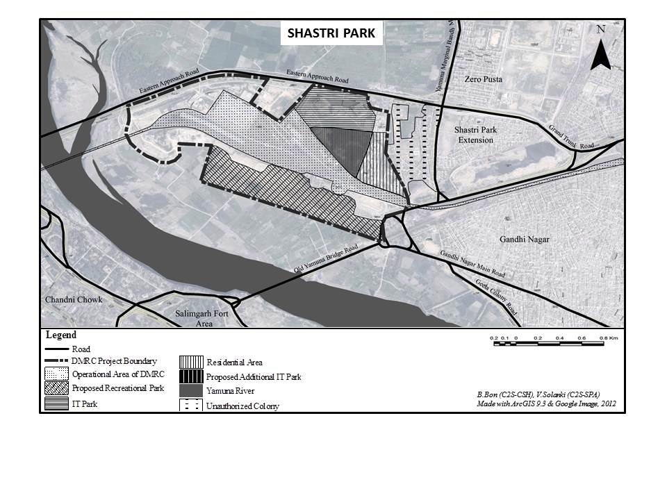 Le projet Shastri Park est quant à lui entièrement développé par la DMRC sur les berges de la rivière Yamuna. À Delhi, ces espaces autrefois délaissés, jugées inconstructibles car en zone inondable et de recharge des eaux souterraines, et occupés par les habitants les plus pauvres, sont devenus des terrains recherchés (Baviskar, 2011). En novembre 1999, 65 hectares sont concédés à la DMRC pour un dépôt, sans que soit défini ou estimé le foncier pour les opérations immobilières. En 2001, un appel d’offre pour un projet résidentiel est lancé par la DMRC, mais aucun promoteur immobilier ne se manifeste. Cette faible attractivité de l’offre est due principalement, selon les enquêtes de terrain, aux réticences des promoteurs pour un projet situé au beau milieu des berges de la rivière.