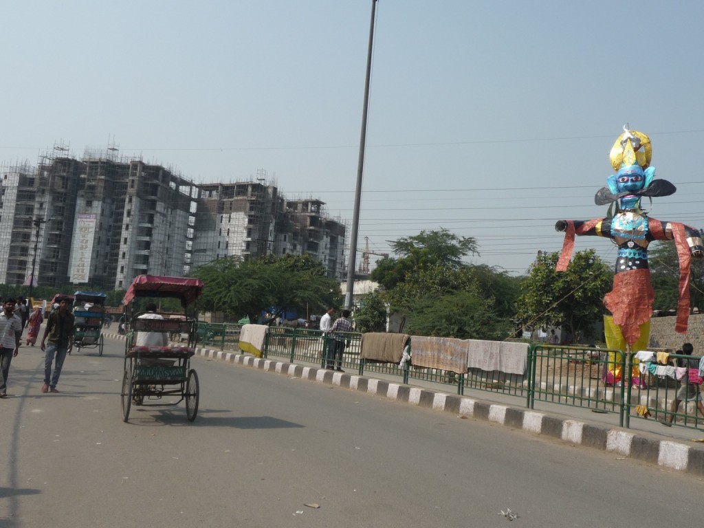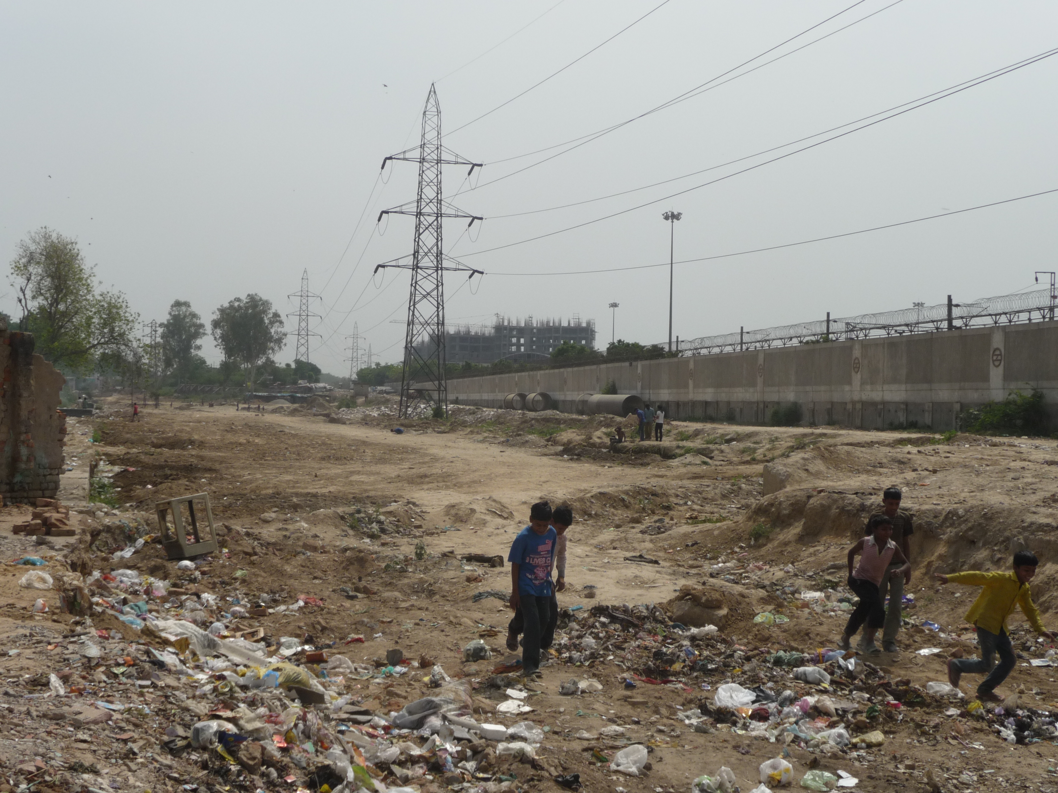 À gauche le projet Shastri Park de la DMRC et à droite les espaces résidentiels réceptacles des impacts directs du grand projet. L'affaissement des terrains provoqué par le grand projet est visible (Bon, 2012)