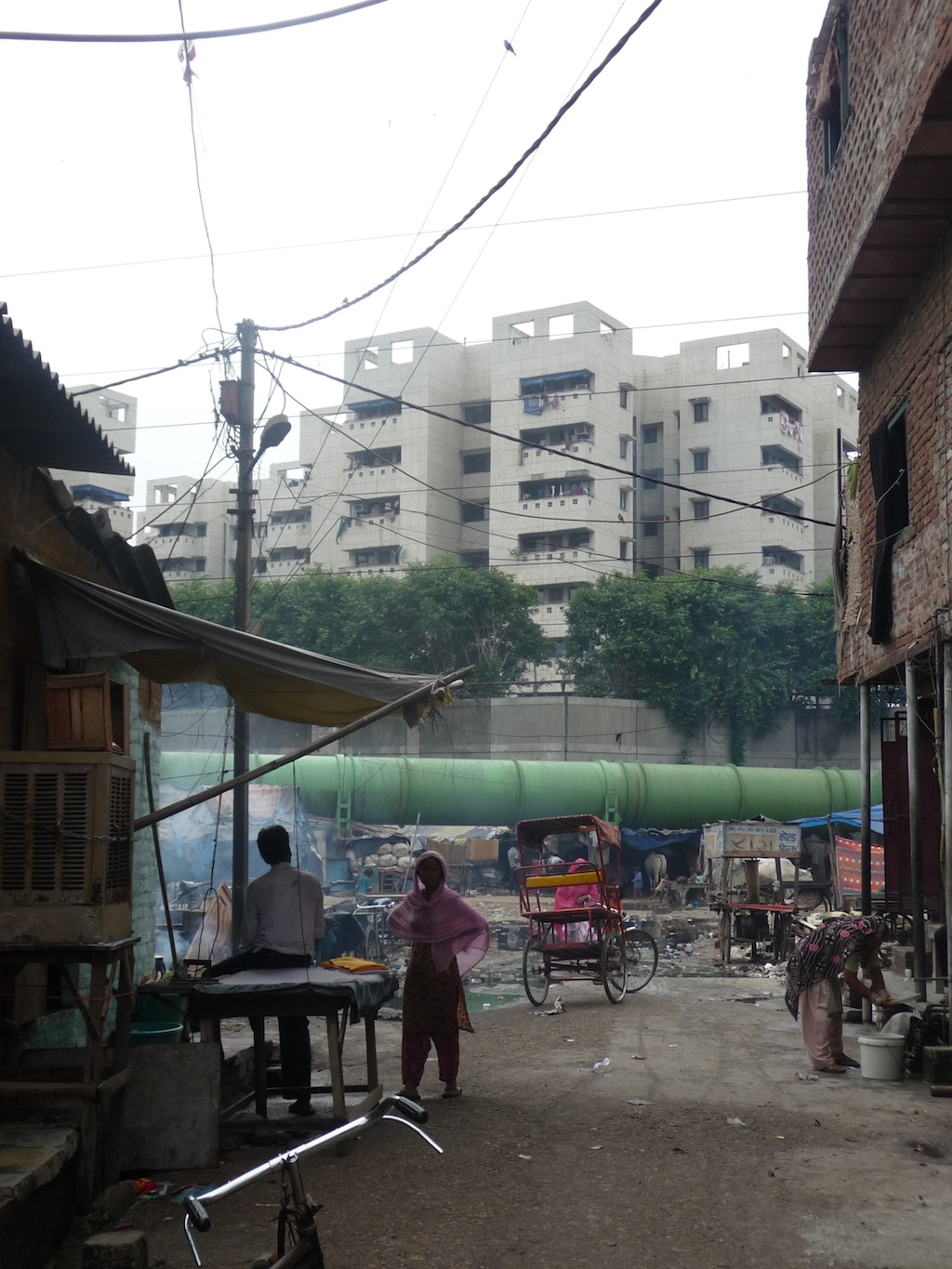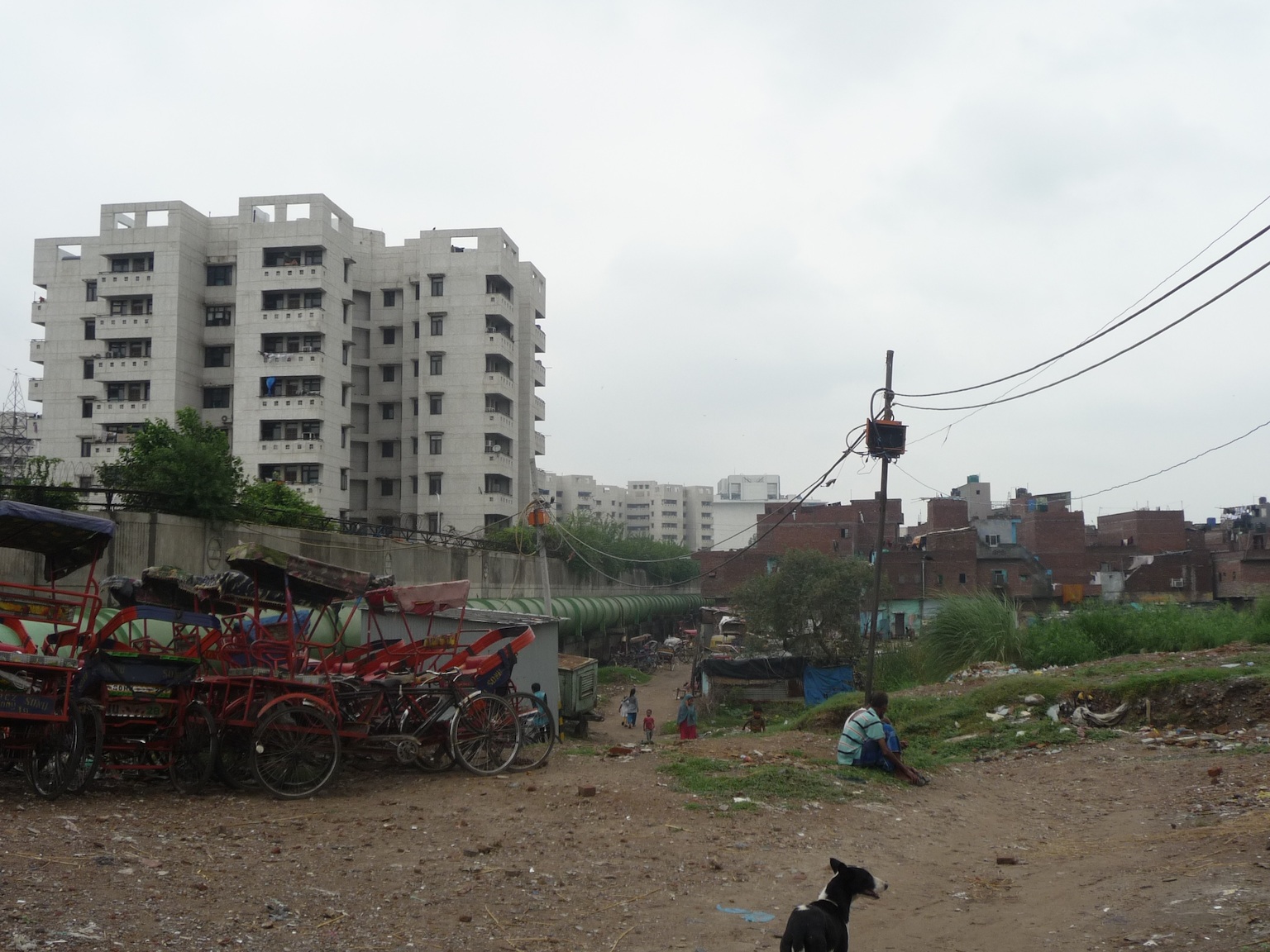 Le projet Shastri Park vu depuis les espaces résidentiels voisins. Les huttes accolées au mur du grand projet sont celles des anciens agriculteurs qui travaillaient la terre à l’endroit où le projet a été construit (Bon, 2012)