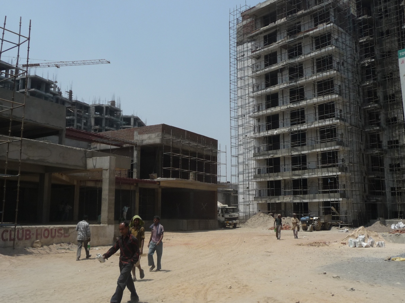 Ouvriers sur un chantier de la DMRC. Le dépôt du métro est souterrain et les condominiums et leurs équipements (piscine, club house, court de tennis) sont bâtis en surface (Bon, 2013)