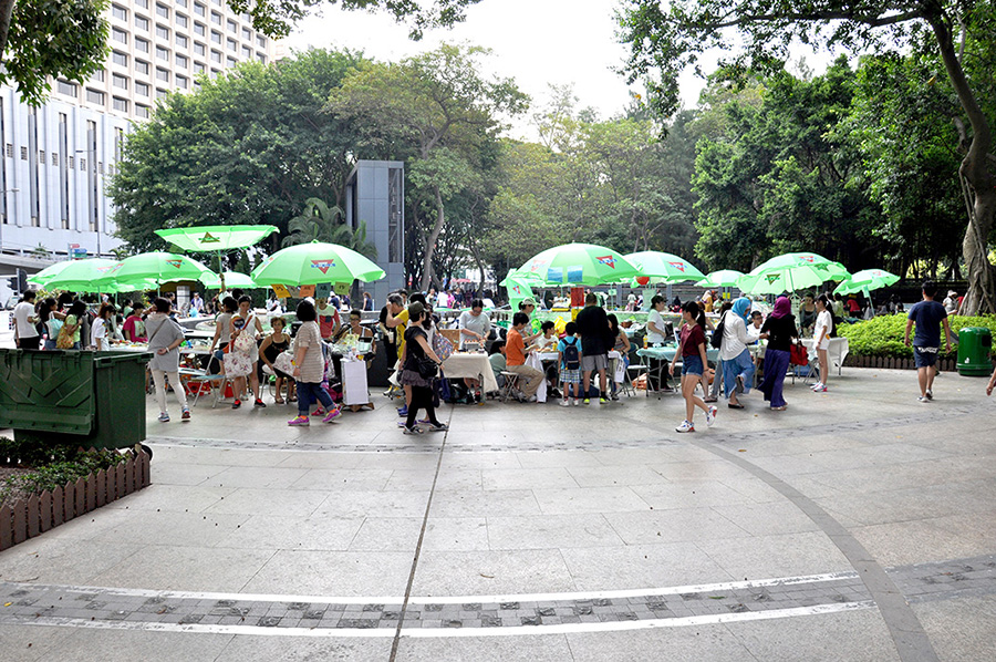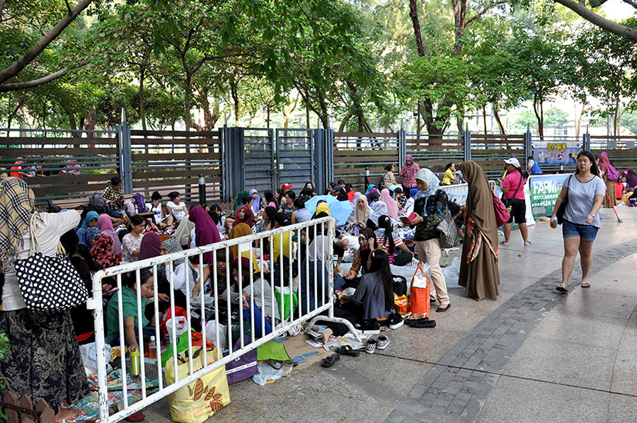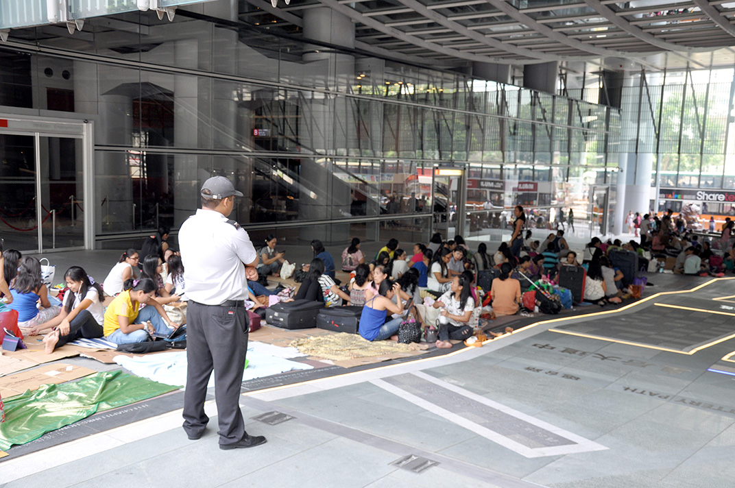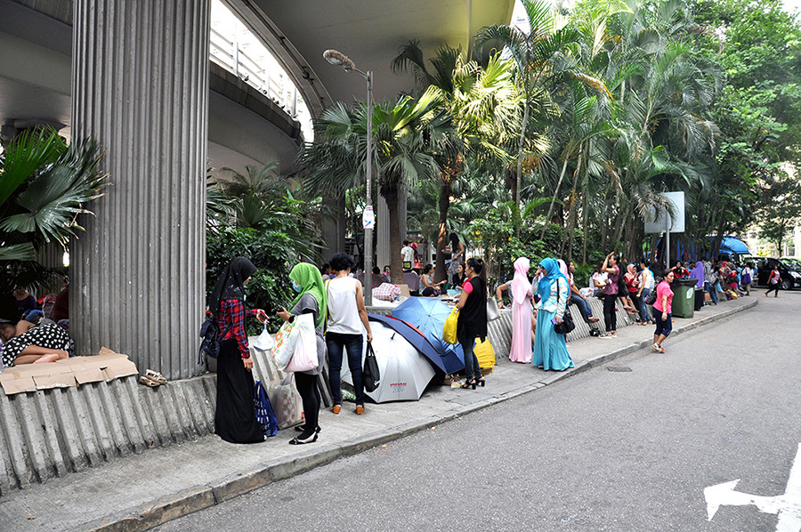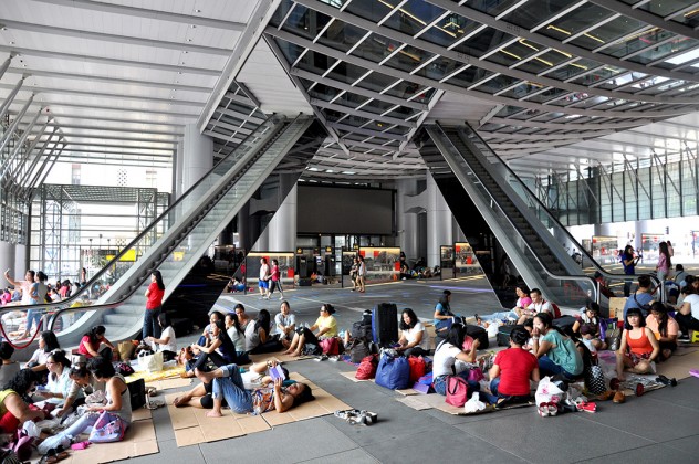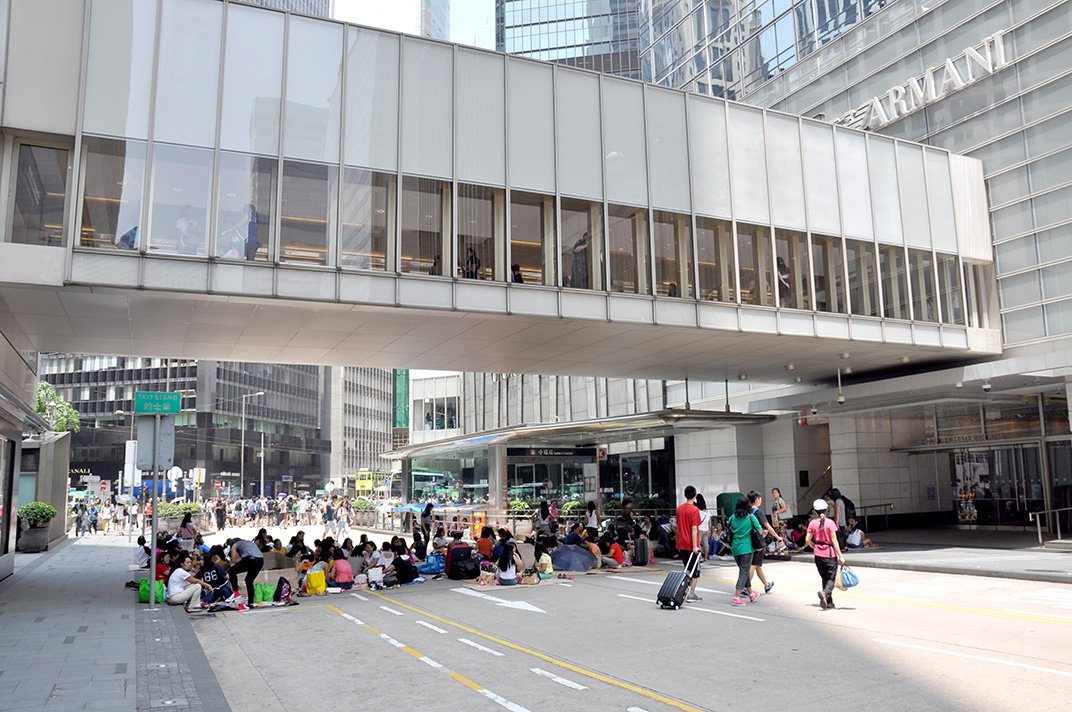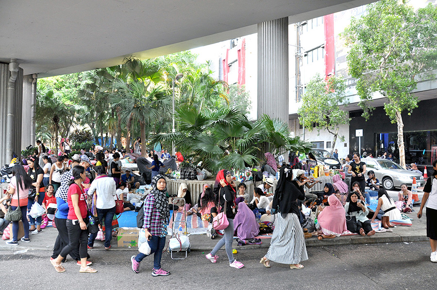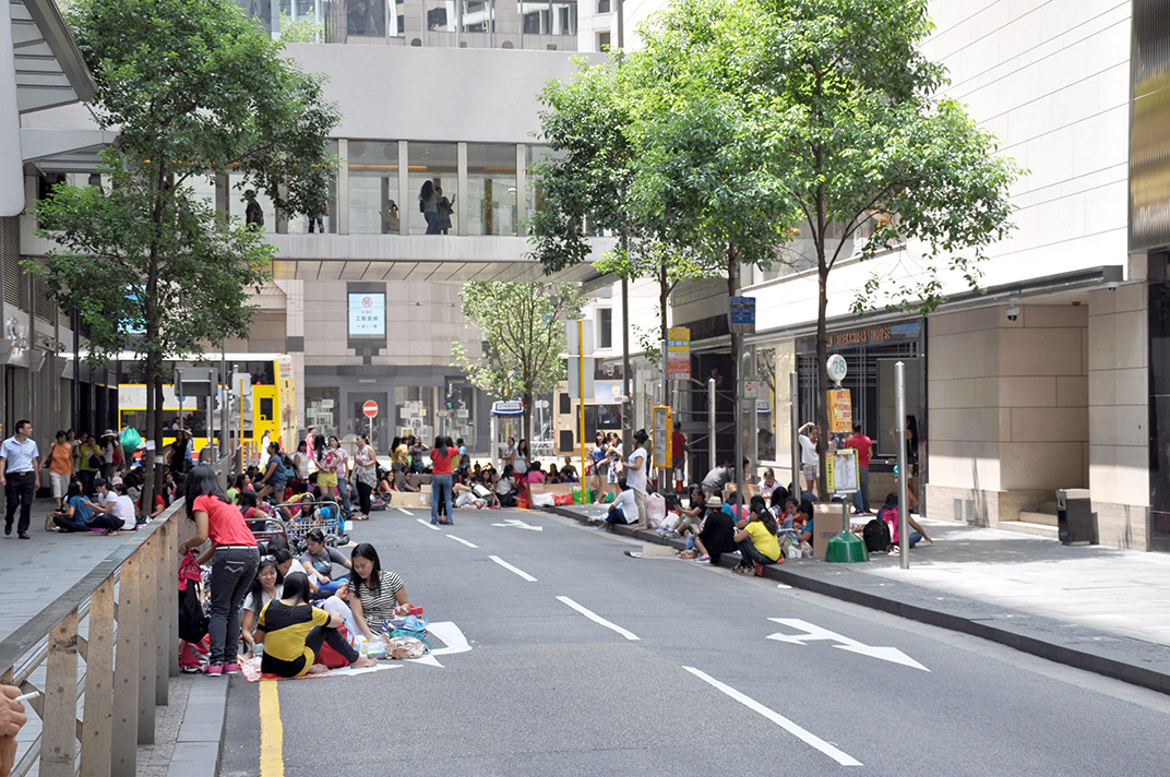 À Hong Kong, dans un contexte de forte densité urbaine, l’espace est rare et souvent dédié aux activités marchandes. De fait, lorsque les travailleurs quittent l’espace domestique de leurs employeurs, il n’est pas facile pour eux de trouver des espaces publics facilement appropriables, même temporairement. Ces travailleurs domestiques investissent alors certains espaces dont l’occupation est libre et gratuite avec souvent la recherche d’une part d’une protection contre le soleil ou la pluie et d’autre part d’une certaine intimité par l’appropriation matérielle de l’espace (par exemple avec des cartons ou des parapluies). Ces espaces résiduels sont donc détournés de leurs usages habituels et font très souvent l’objet d’un encadrement pour les délimiter, voire les surveiller, par les acteurs publics ou privés qui gèrent ces lieux. À l’invisibilité de la semaine succède alors un moment de forte visibilité dédié au repos et au divertissement et à différentes activités communautaires, voire militantes, avec l’installation de stands ou l’organisation d’évènements.