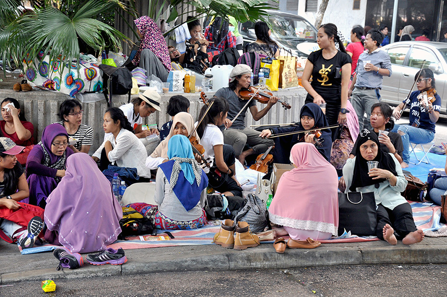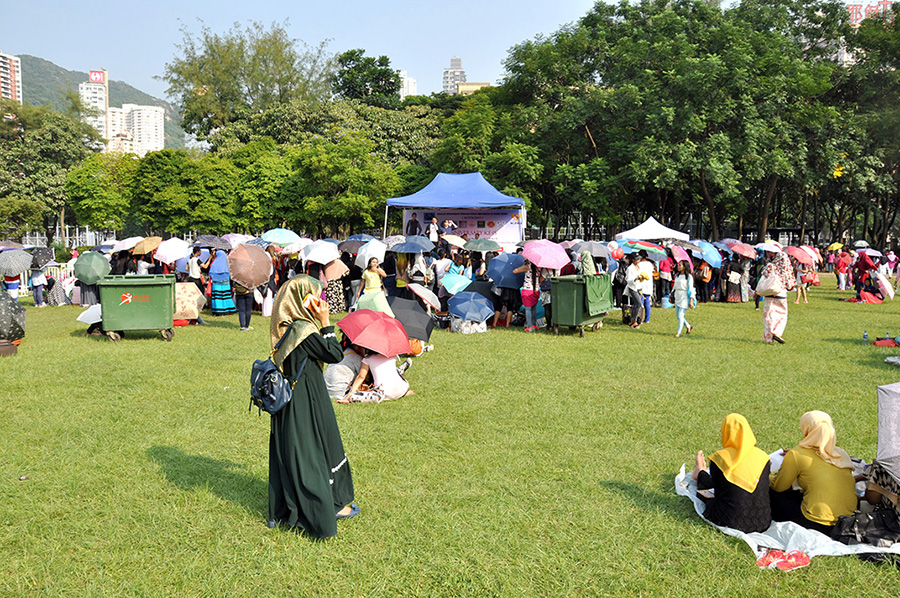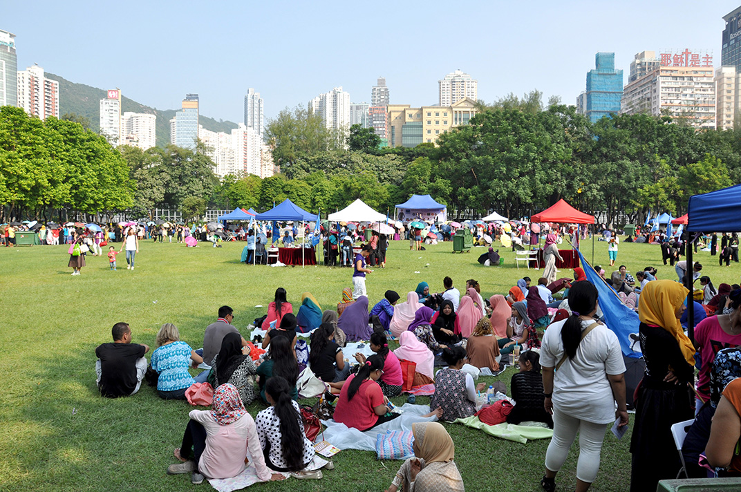 Ce régime d’invisibilité s’inverse le dimanche. Alors que les travailleurs domestiques disposent de droits assez réduits, le dimanche est bien souvent la seule journée de congé de la semaine où ils peuvent quitter le domicile de leurs employeurs. Cette situation n’est pas spécifique à Hong Kong et se retrouve dans d’autres villes telles que Singapour en Asie ou Nicosie en Europe (Akoba et al., 2013). Lors de ce repos hebdomadaire les travailleurs domestiques en profitent pour se reposer et surtout se divertir. Ces rassemblements sont donc des moments assez joyeux qui s’organisent en fonction des appartenances à des communautés nationales qui recoupent aussi des affiliations religieuses (les Philippins sont majoritairement chrétiens et les Indonésiens majoritairement musulmans).