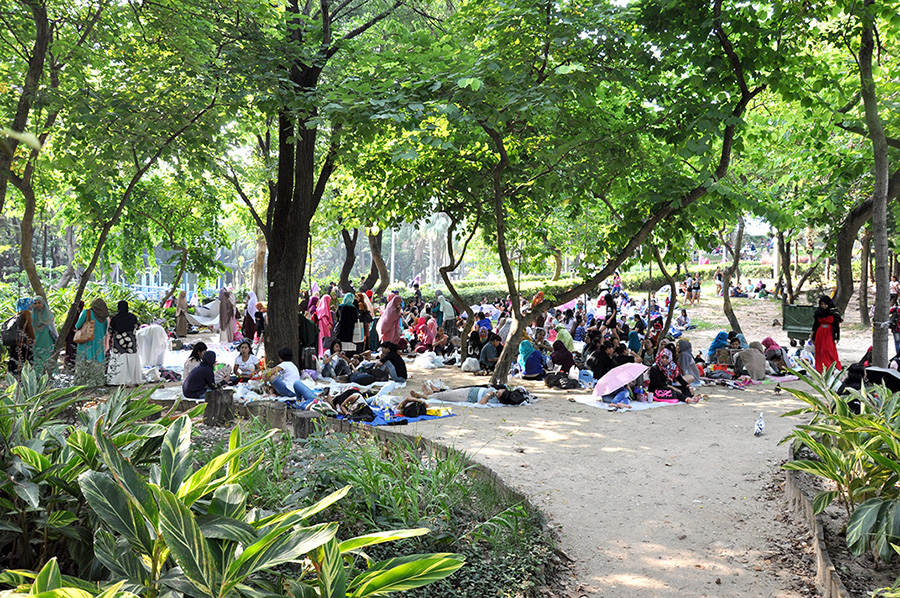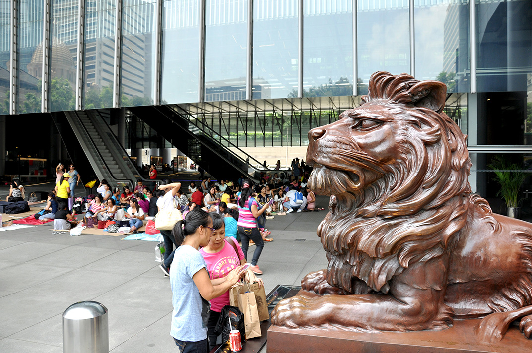 Pendant la semaine, les espaces publics du centre-ville sont généralement occupés par des travailleurs et des touristes et offrent ainsi une vision attendue de la globalisation avec le développement des activités tertiaires de haut niveau et une certaine opulence. Les employés domestiques travaillent alors discrètement auprès de leurs employeurs et sont donc quasiment invisibles des espaces publics (Husson, 2013).